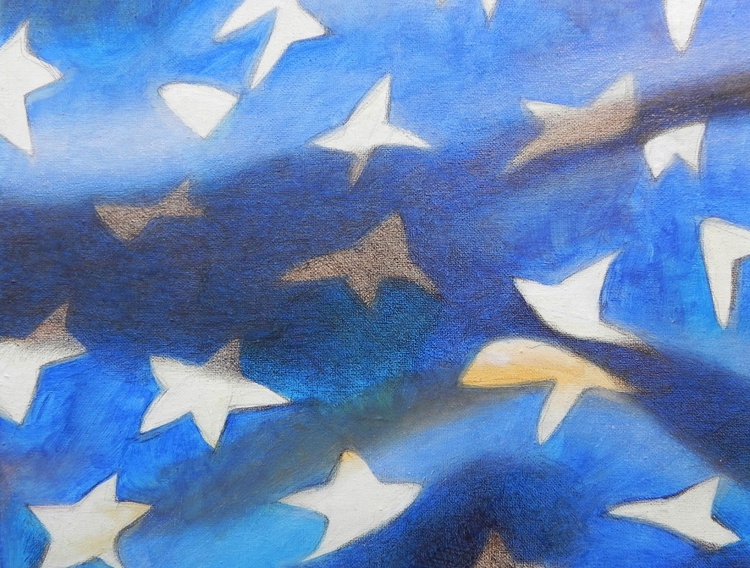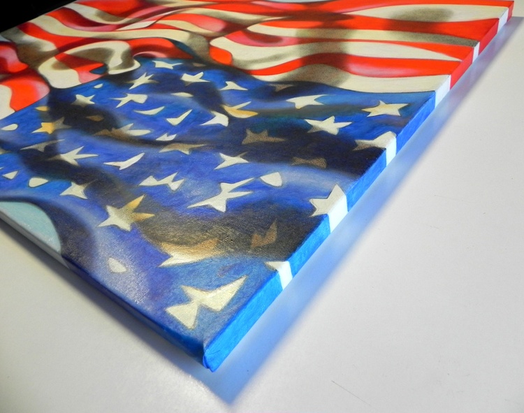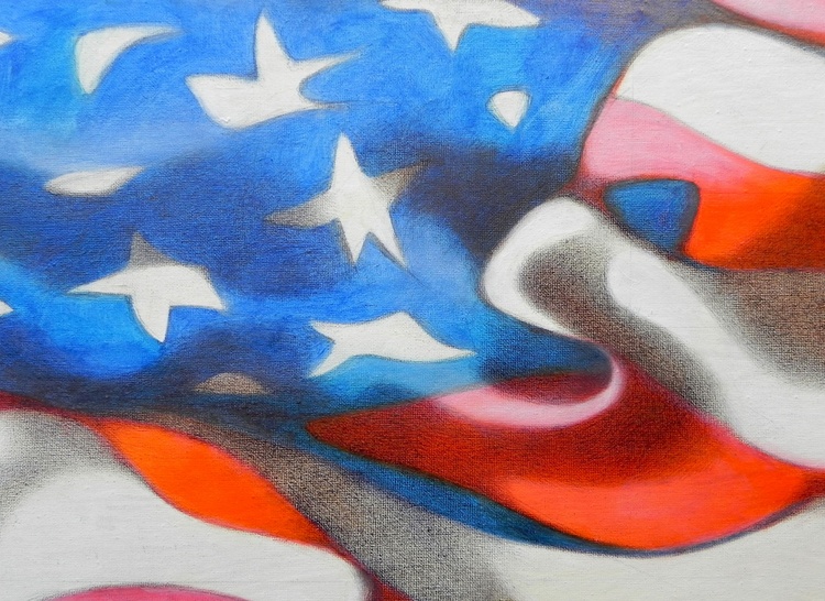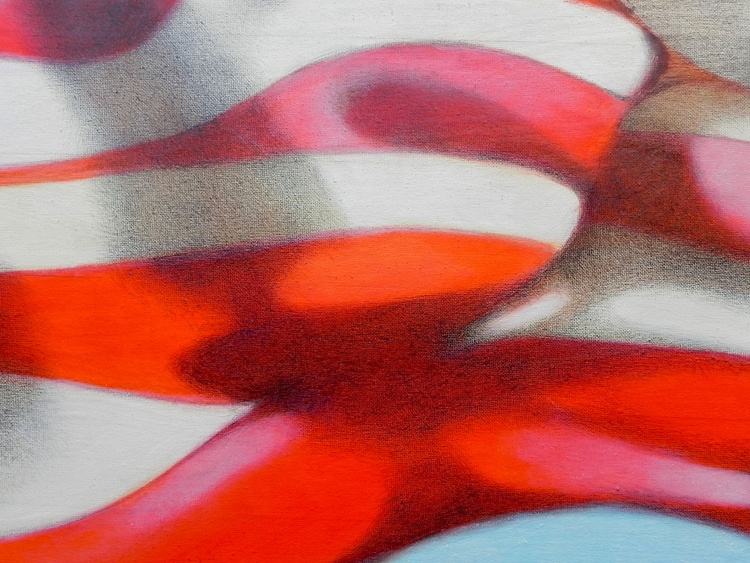 An original piece from the series “Flag”; oil and graphite pencil on canvas; 50 x 75 cm, 2014. In case of sale shipping is worldwide free. Every time that I come back home from a journey or a holiday, I always find, among the photographs that I’ve took, some flags. I am particularly fascinated by those flags moved by the wind, where the geometries of the colored tissues overlaps on the spirals of folds and on the shadows generated by the movement. It’s even better if the flag is old, maybe a bit ripped, marked by the time that they spent to wave, maybe a little faded or dirty from the dusty air they crossed. Note: this canvas can be hung either vertically or horizontally.