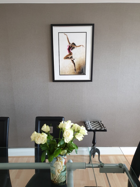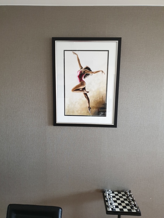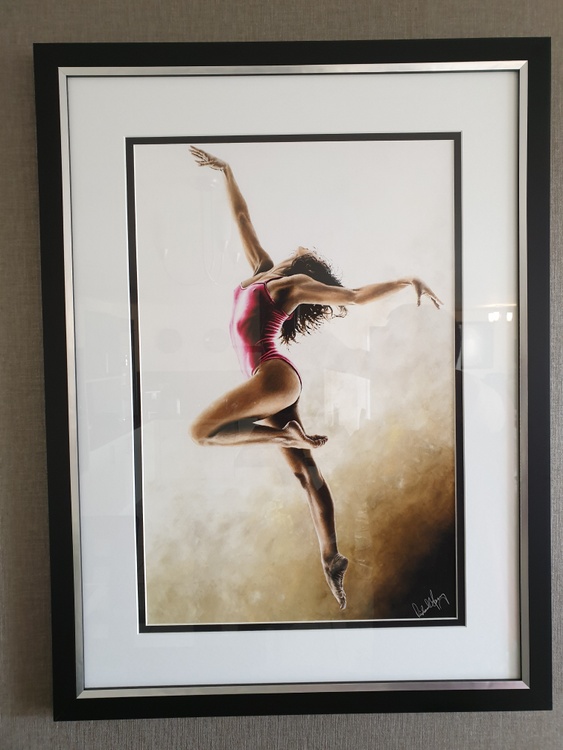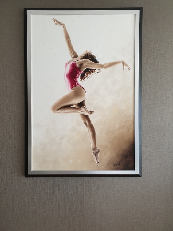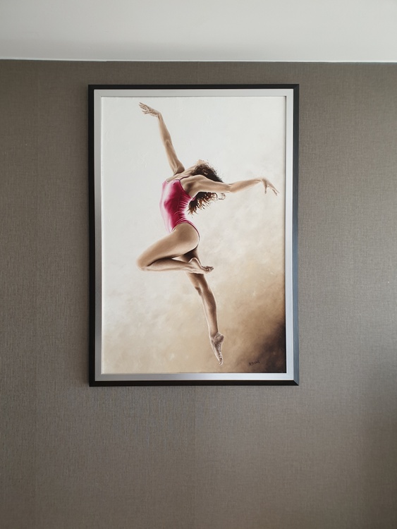 Fine art original oil painting on a stretched cotton canvas, created using a knife. There's a very high level of fine detail in this carefully composed, contemporary but photo-realistic painting. The ballerina model is simply beautiful. It's a sensual composition, full of hidden meaning, passion, drama and emotion. She's oblivious to the viewer and proud of her physique and sensuality.