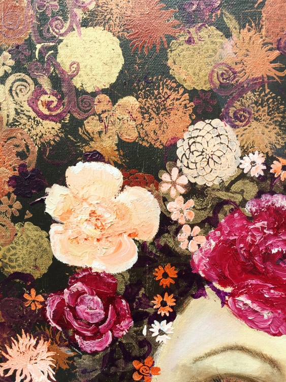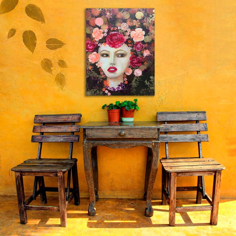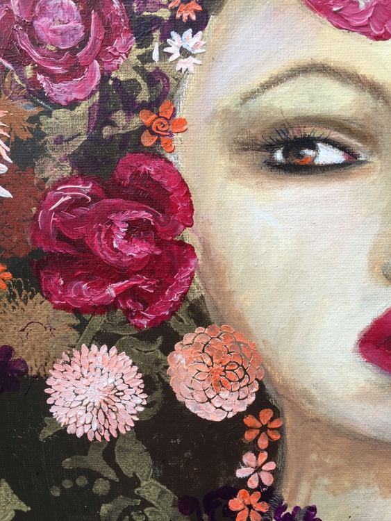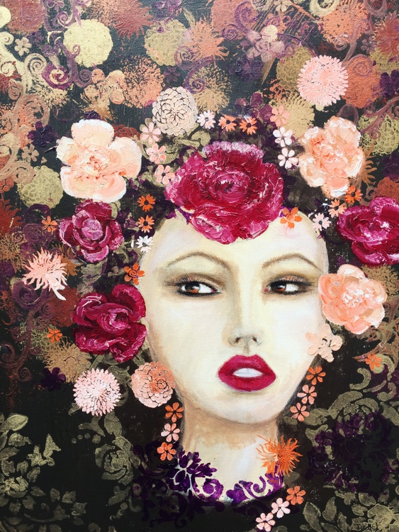 Original painting on stretched canvas I named 'She's not sure about you'. Collaged background painted with acrylic paints using stamps and hand painting of the flowers. Her face was created in oil paint with many thin layers. The painting is sealed with Gamblin varnish to preserve her and comes ready to hang with fixings attached. She will also come with a signed certificate of authenticity and be very carefully wrapped and boxed for postage by courier/mail. Size 22' x 18' x 3/4 inch/ 56 x 46 x 2 cm approx One of a kind, original art by Jo Walsh
