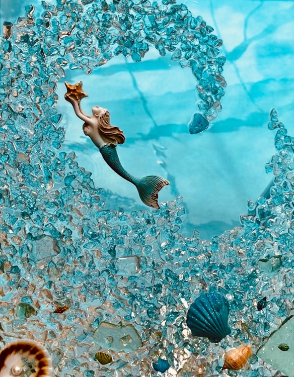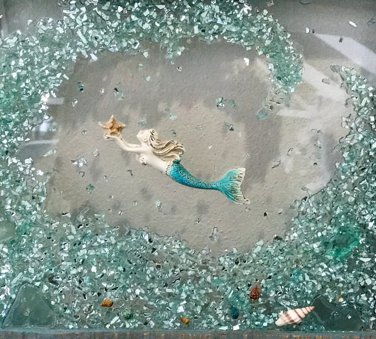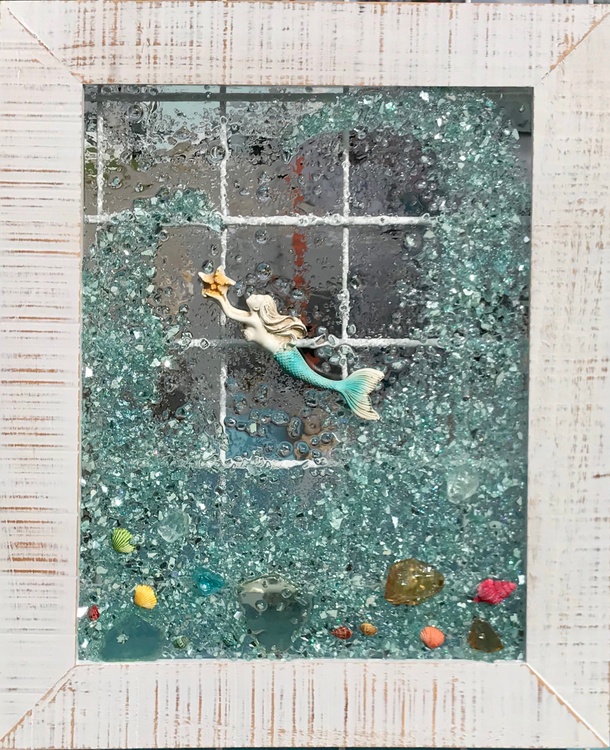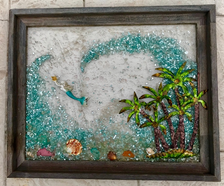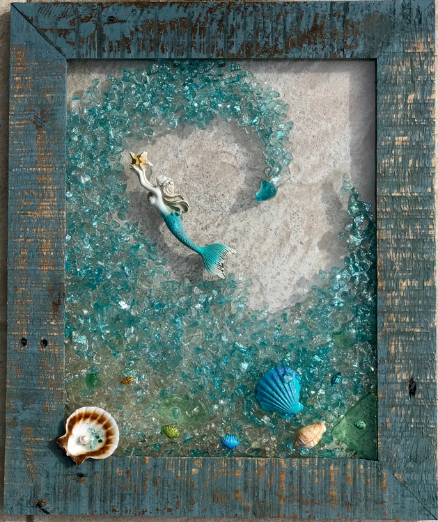 This beautiful piece measures approximately 16 x 20 in a distressed wooden frame available in teal, white or grey. Each piece is uniquely designed and signed by the artist.