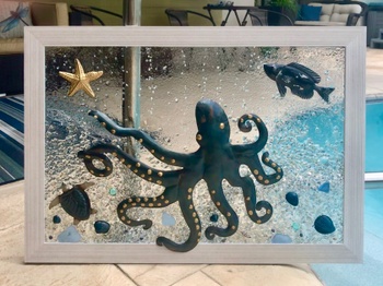 This statement piece depicts a large dark blue & gold octopus swimming with a starfish, turtle and fish underneath the surface of the sea. Piece measures 34” x 24”
