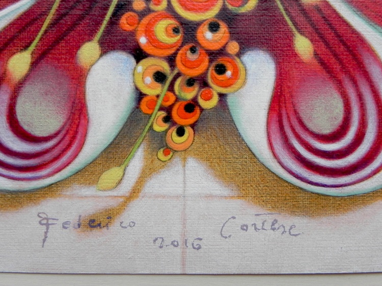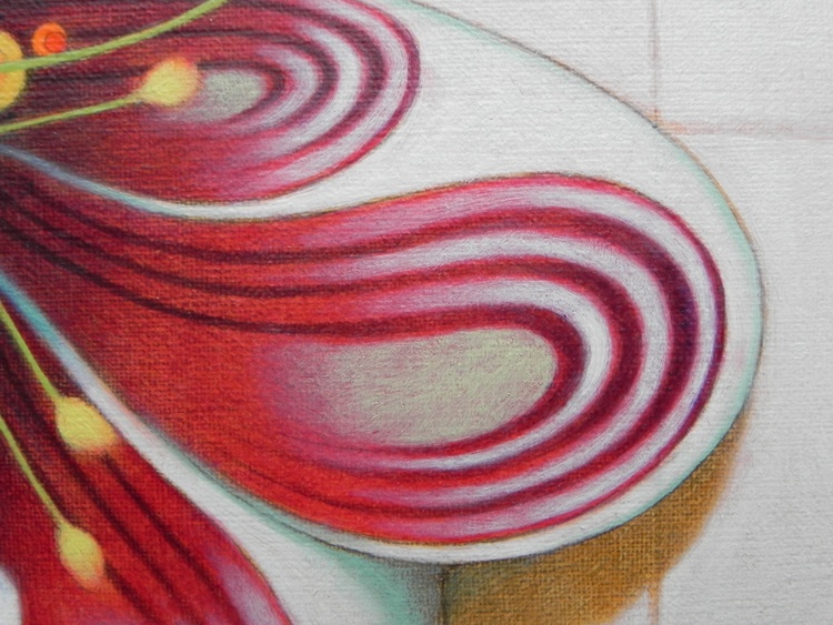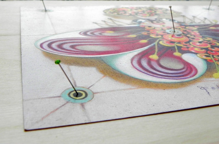 An original piece from the series “Please do not kill butterflies”, pins and oil on paper, mounted on a wood panel. 28 x 25 cm, 2016. Original sold. Please, all these dead animals ... Of course, not every one of us can or want to become vegetarian. Sure, in some cases, maybe, the medical experimentation needs them to get results. But we really have to kill them for our frivolous activities? ... Is it necessary to have so many pink pigs die in front of a camera? Do we really need to dissect sharks in formaldehyde, to starve stray dogs tied to a chain in the corner of a gallery, or to make innocent ants go crazy in twisted tubes of plexiglas? To make these drawings, no butterfly was killed.