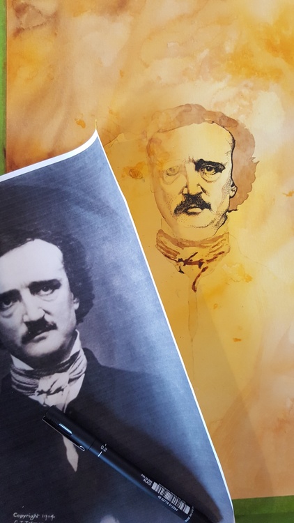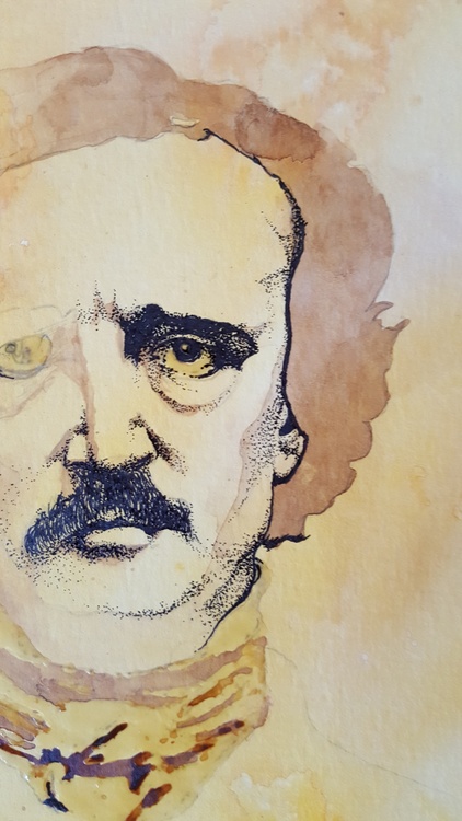 Edgar Allan Poe portrait in acrylic inks and fine line pen