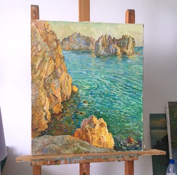 When the blazing sun hangs low... when the wind dies away and the sea foam sleeps... and twilight touches the wandering earth... Secrets of Marine Painting by Dubrovskyy Aleksandr - **Oil, showcase** https://www.youtube.com/watch?v=s9VIyyeuUaQ Painting Artist: Painter Dubrovskyy Aleksandr? Title: In the setting sun Evening Size: 69,7 x 59,7 x 1 cm Medium: oil on canvas Year: 2005 Style: impressionism? Shipping 7-14 days The picture is painted in the Plein Air. The picture is painted on canvas with oil paints. Responsible for the quality of each of my paintings. I am sending a picture of a well-packed in a cardboard or plastic box with plastic foam. I wish you a nice view and a good choice. Always yours Aleksandr Dubrovskyy!