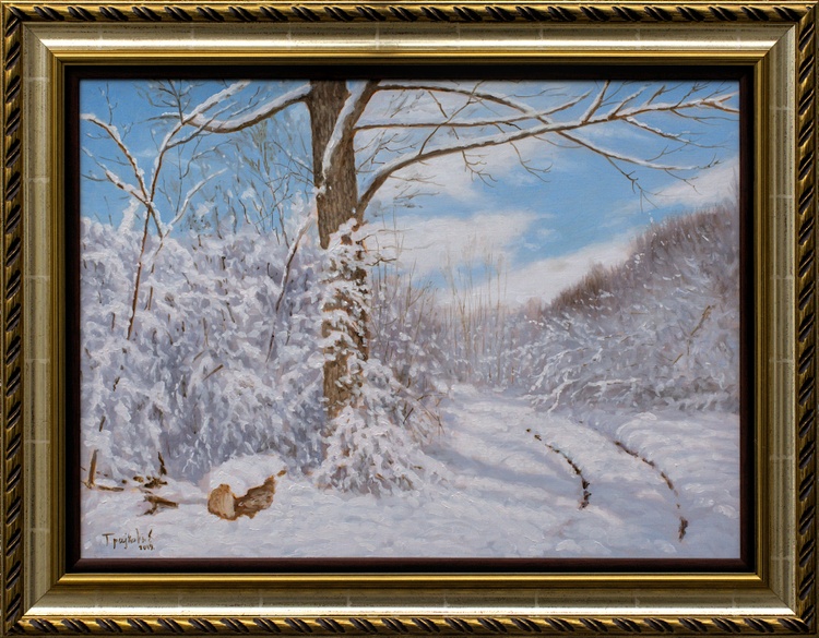 Once upon a time in the forest near my living place. Yes, this forest is very close to me. I spent lot of time there in all seasons. Winter is surreal there with this magnificent light. Original oil painting. Painted using high quality oil colors. Varnished and framed. Ready to hang.