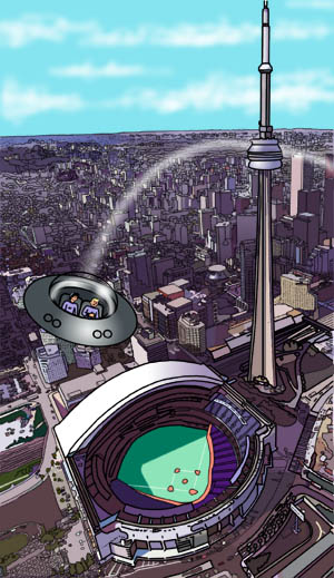 Illustration of the Skydome, the CN Tower and downtown Toronto from the graphic novel The Adventures of Spike and the Deederoos. You can read the first 13 pages of this graphic novel at www.geocities.com/mikemooreartist