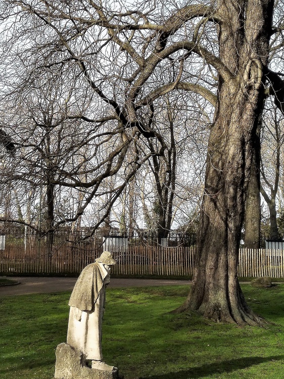 Amazing photo ,an old weather beaten statue of an old man ,with an old tree,how befitting as they grow old together,,,,,is this anyone famous,,,,,,I've seen in many countries where they carve a face or even the whole front side of a person right into the tree,This is stunning how the branches in the summer full of leaves protect this Statue.Im quite sure this park has many stories to tell about this absolutely Amazing statue.