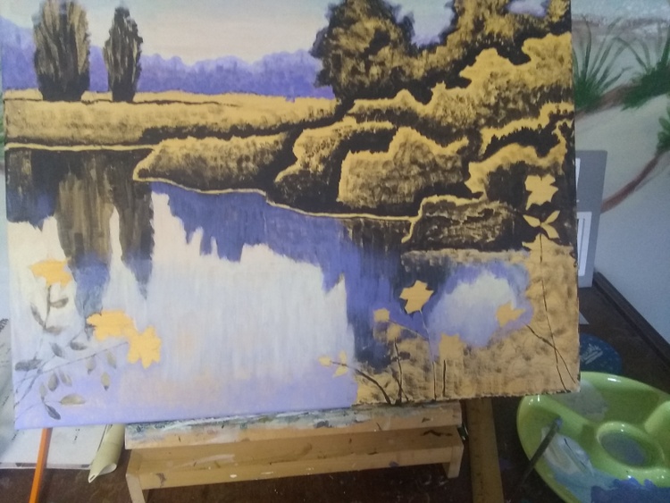 An original 24x18 inch acrylic painting on stretched canvas depicting a serene pond with floral reflections. Painted with care to have equal portions of warm and cool colors, with water rings having a grounding mental affect.