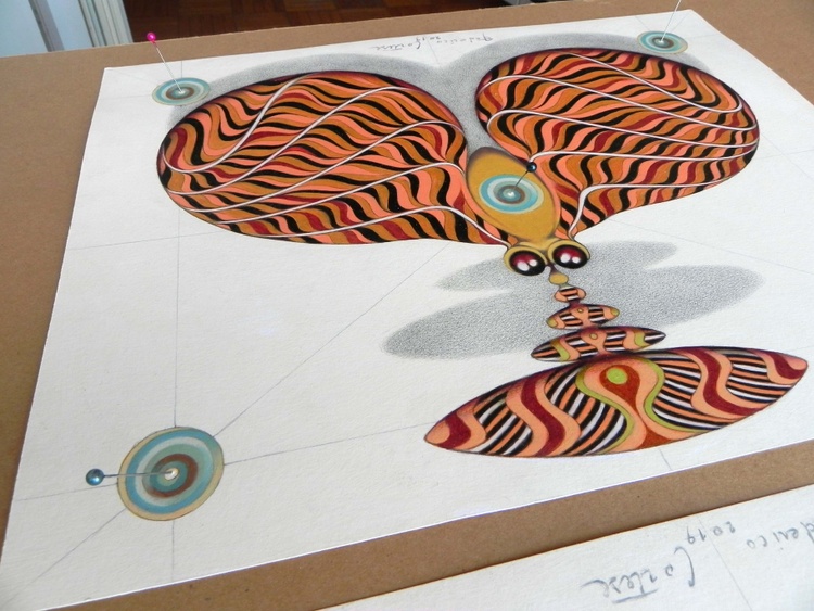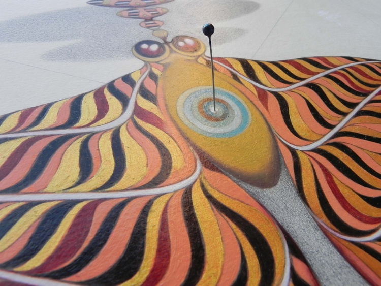 From the series “Please do not kill butterflies”, pins and oil on paper mounted on a wood panel, 35 x 28 cm, 2019. Please, all these dead animals ... Of course, not every one of us can or want to become vegetarian. Sure, in some cases, maybe, the medical experimentation needs them to get results. But we really have to kill them for our frivolous activities? ... Is it necessary to have so many pink pigs die in front of a camera? Do we really need to dissect sharks in formaldehyde, to starve stray dogs tied to a chain in the corner of a gallery, or to make innocent ants go crazy in twisted tubes of plexiglas? To make these paintings, no butterfly was killed. In case of sale shipping is worldwide free.