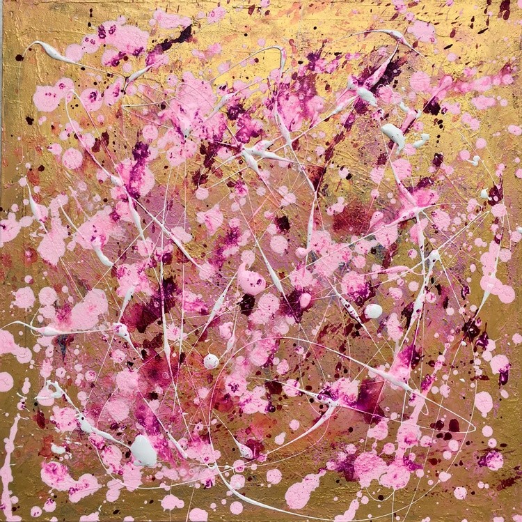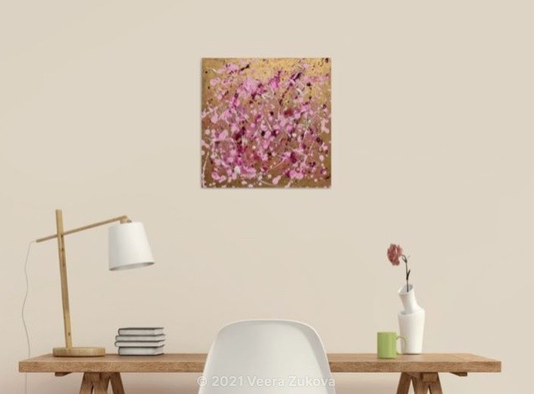 Colorful abstract action painting. Acrylic on stretched canvas. Today we had very hot sunny weather and acrylics were drying super fast. So I decided to make a painting using these fast-drying conditions. First I applied a lot of light pinks. I think two bottles of color for the background. And while it was drying I was spreading the color by my hand and after it was dry I added more colors and finished work by action painting. The ultraviolet part is watercolor. The final artwork was sprayed with transparent acrylic so that the artwork is protected from dust and humidity and all the colors are really shiny. I will add this artwork to my redbubble, society6, and threadless accounts to see what great designs they offer. If you do not want the original: you can have printed. The artwork is called coffee because it reminds me of my feelings after a morning cappuccino on my sunny terrace. The artwork is very positive, inspiring, and beautiful. It is gentle and decorative. I have added a digital version to my redbubble, society 6, and threadless accounts.