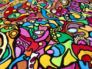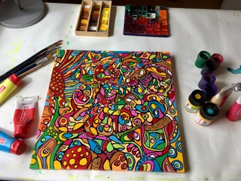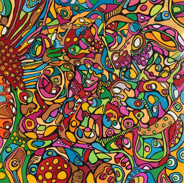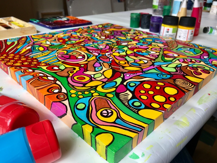 Have you ever seen so bright colors before? Imagine how much pleasure our brain and soul are getting from looking at this kaleidoscope of colors. It is extremely stimulating for the brain. Your mood will fly high like a rocket. This artwork is your espresso in the morning. It is cute. It is sweet. It is awesome. I am blessed to transmit this kind of art to our world. I have a very sensitive personality - and this enables me to create such original, unusual, and unique art. All images are coming from a subconscious level. I never get inspired by any other art nor copy somebody's work. That is why my artworks are like original pearls found in the ocean. In the morning I run to my studio to catch the morning light with positive vibes and listen to great music to bring out a big wave of inspiration that hit me often. I am a very artistic, sensitive clever person, I love diversity - that is why all my artworks are like bombs of colors and shapes. I paint only when I am very inspired. I have my own studio, where I can concentrate to the fullest on my art. Art is everything to me. Art is my love. The artwork is covered with transparent acrylic and is ready to hang without a frame, as it is painted also on the sides.