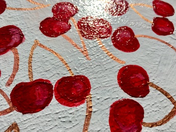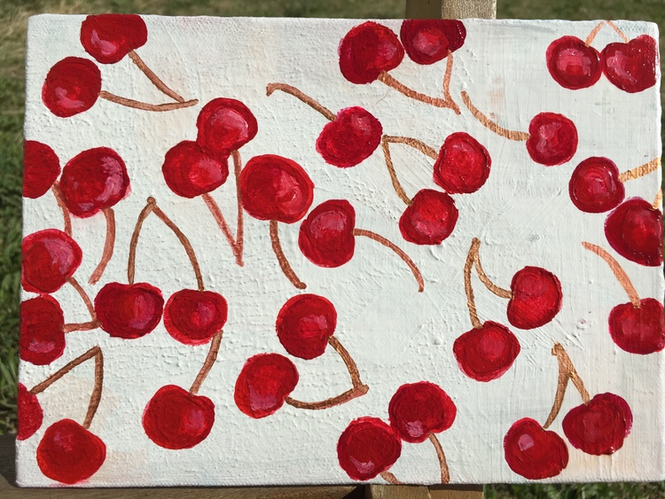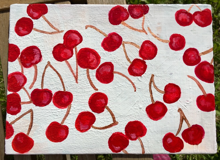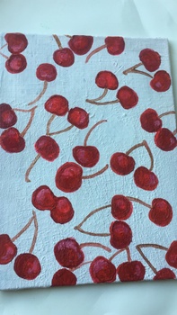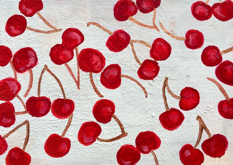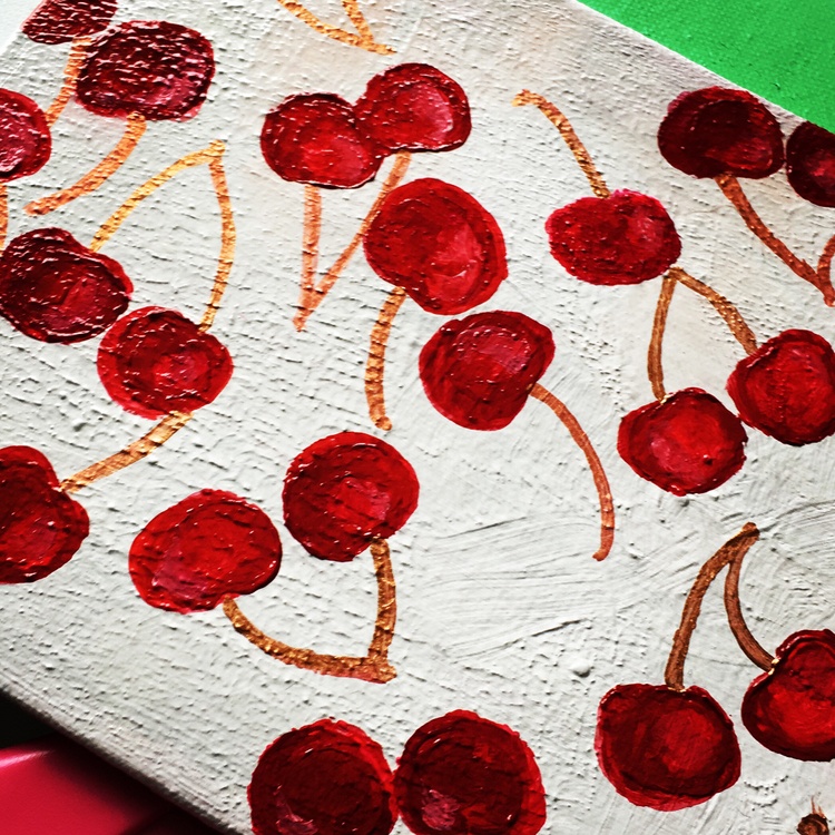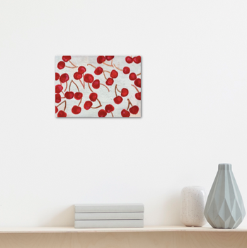 Sweet little cherries painted on a sunny morning. I think this artwork is really sweet and cute. Please see the video for seeing the colors. In the main picture, colors are scanned. The camera does not see scarlet tones very well. Size is pretty small: 16*22*0.2 cm, A pink, red or white frame will suit this work greatly. My signature and details are on the back of the artwork. It is sprayed with transparent acrylic and I will ship it in a hard envelope to you.
