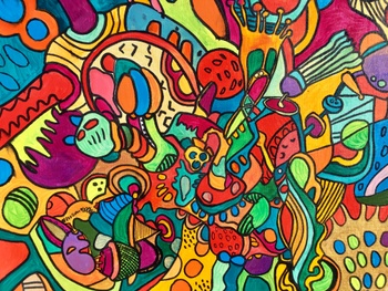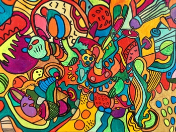I have my own unique style. My personality is very intense, so is my art. Bold, interesting, diverse, rich, etc. Everyone thinks that we are living in a material world. But we are not. We are living in the cosmos and our brain is transmitting electromagnetic signals to us in form of colors, shapes, smells, temperature. What are we, who are we? My subconscious doodling is a study of subconsciousness and human cosmic energy. All the lines come out of me automatically and I struggle if I do not have my art materials near me. These are messages like crop circles. Mystery.