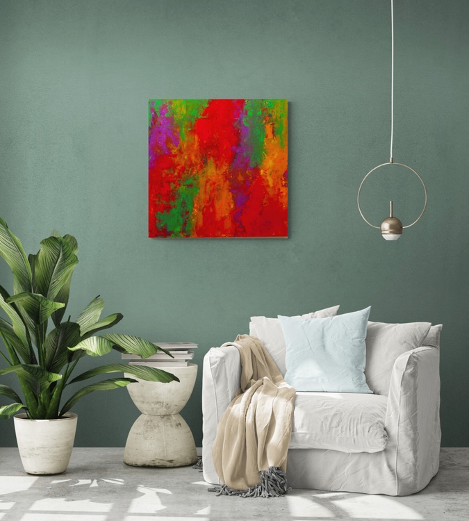 Red with Green #3 is a 24 x 24 inch contemporary abstract painting on museum stretched canvas. This color field painting by joseph piccillo was painted with the concept pf exploring the primary colors. Color as it affects our emotions. Red to me has a primal exciting feel especially when complimented with green. This painting has an explosion of color both exciting and comforting. #paintingsbyjosephpiccillo #contemporary abstract #modern #fine art