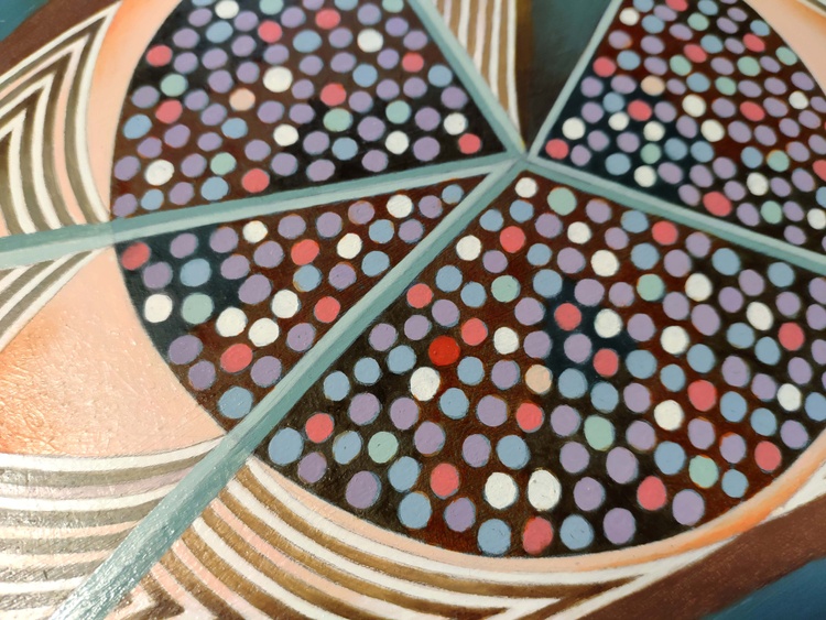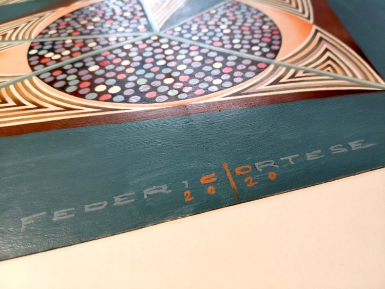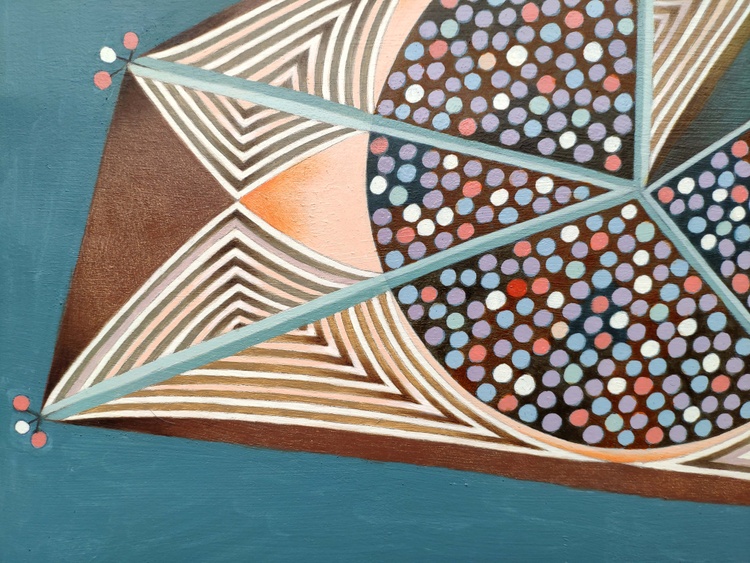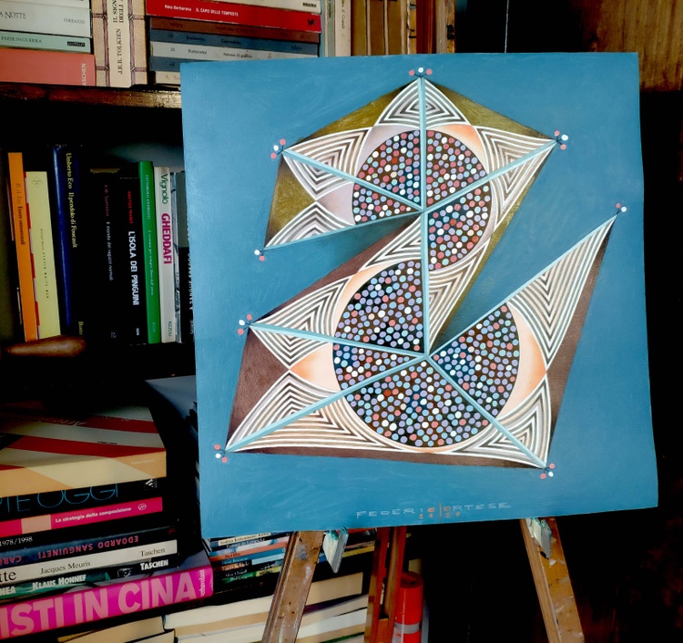 An original piece from the series “Embroideries”; pencil, ink and oil on paper; 40 x 40 cm, 2020. ORIGINAL SOLD. The maps of the sky, unlike the traditional maps, have no edges or boundaries. Here there is no demarcation between land and water, there is only the position of dots representing the stars in the vacuum of space, and possibly the lines joining these points, to create similarities with animals, symbols or objects that help us remember and recognize. The plot of these points and these lines creates a fictional embroidery. This is the starting point from which I begin this series of paintings. But here the map quickly becomes tangled and twisted. Symbolic forms and objects appear. At first they seem to be of value in orientation, but soon they reveal to be obstacles, capable of generating a maze, and so you get lost, passing from a geometric order to the chaos of a tangled skein.