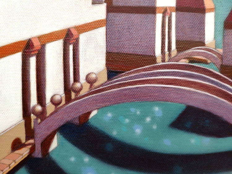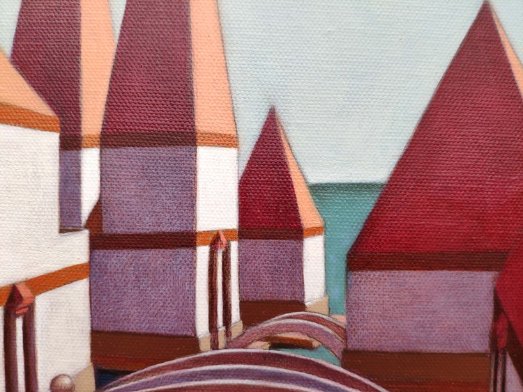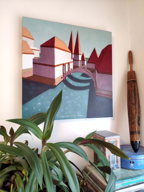 From the series “Virtual model”, oil on canvas, 50 x 50 x 5 cm, 2020. I like to create imaginary worlds. Using the modeling software I invent virtual simplified realities, probably the result of travel memories and past experiences. I choose the types of buildings, I place them on a fictitious ground, check the colors to the various parts, the lights, the elements of the landscape. And then I choose a point of view and portray this place of fantasy. The traditional landscape painting has to deal with the atmospheric variables, with the mutability of natural light. Here, on the contrary, not only everything is static, but I can change the various elements at will: add or remove pieces, move something, try the effects of shadows depending on the movement of the lights. But it is a small difference, and also the difference between "real" reality and virtual reality is now small: it has become part of our daily lives, changed our way of perceiving, and somehow has itself become real. In case of sale shipping is worldwide free.