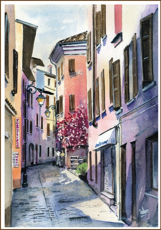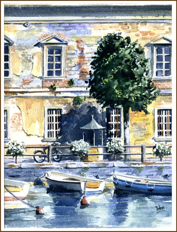 In the south of Lake Garda, the river Mincio drains the lake. In Peschiera there is a short walking path along this river where there are some impressive old buildings. Image size: 260 x 360mm
