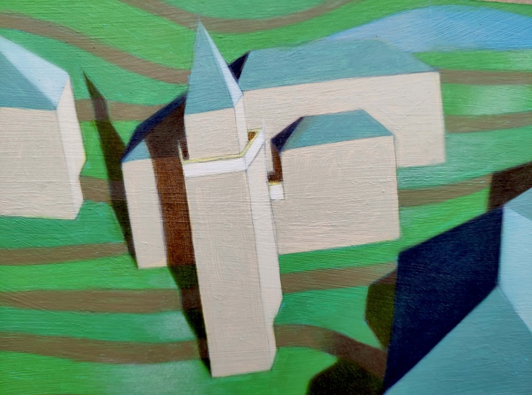 An original piece from the series “Virtual model”, oil on thick paper, 40 x 40 cm. ORIGINAL SOLD. I like to create imaginary worlds. Using the modeling software I invent virtual simplified realities, probably the result of travel memories and past experiences. I choose the types of buildings, I place them on a fictitious ground, check the colors to the various parts, the lights, the elements of the landscape. And then I choose a point of view and portray this place of fantasy. The traditional landscape painting has to deal with the atmospheric variables, with the mutability of natural light. Here, on the contrary, not only everything is static, but I can change the various elements at will: add or remove pieces, move something, try the effects of shadows depending on the movement of the lights. But it is a small difference, and also the difference between "real" reality and virtual reality is now small: it has become part of our daily lives, changed our way of perceiving, and somehow has itself become real.