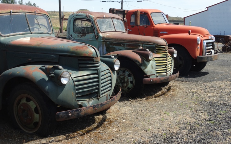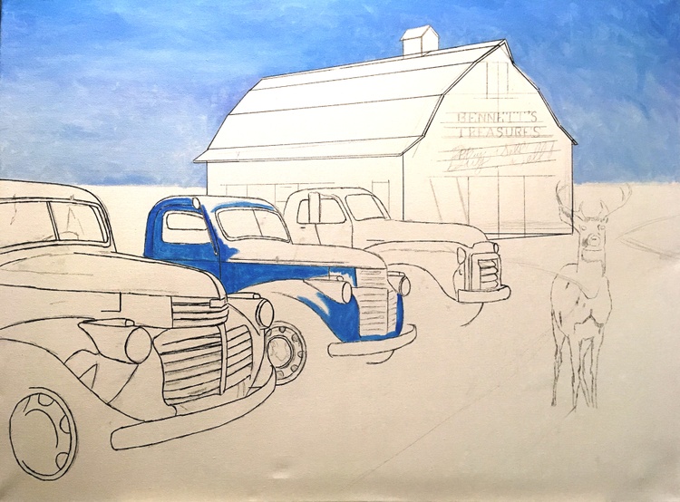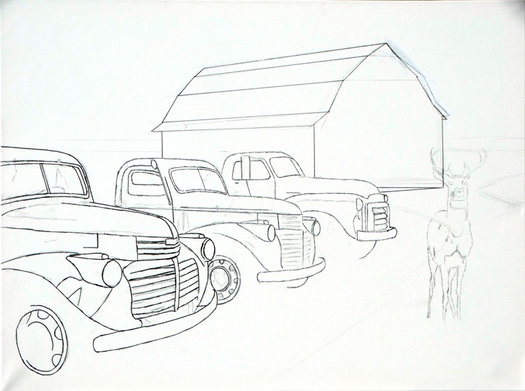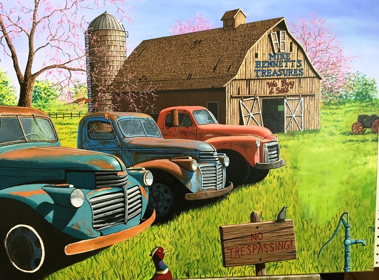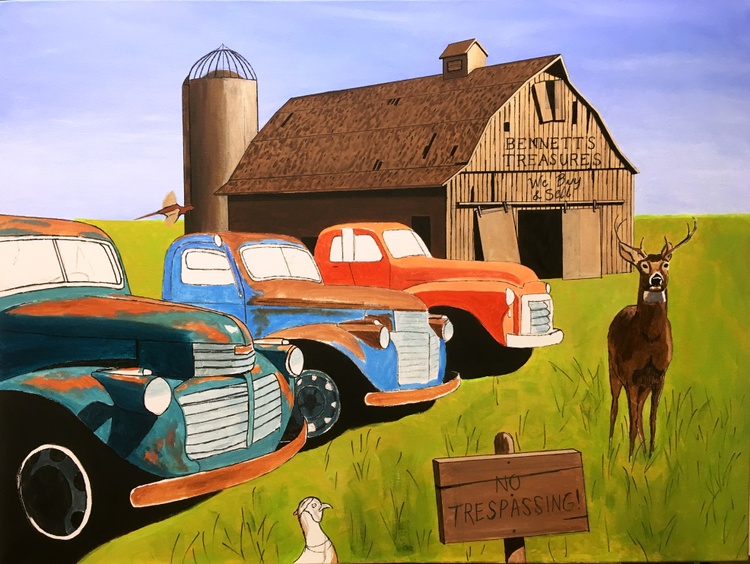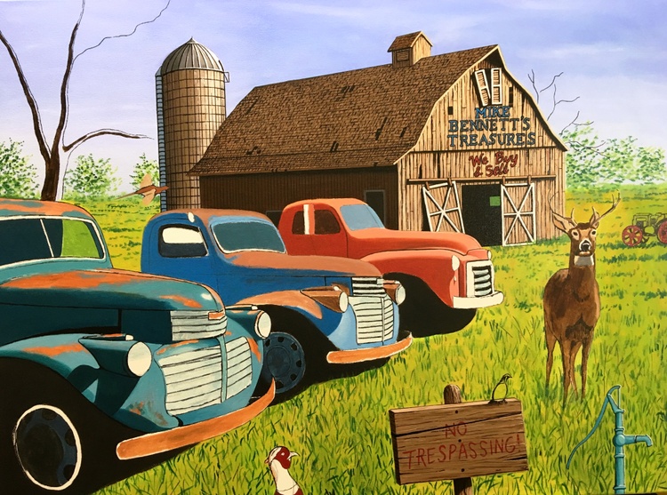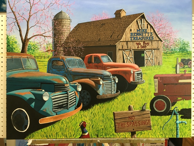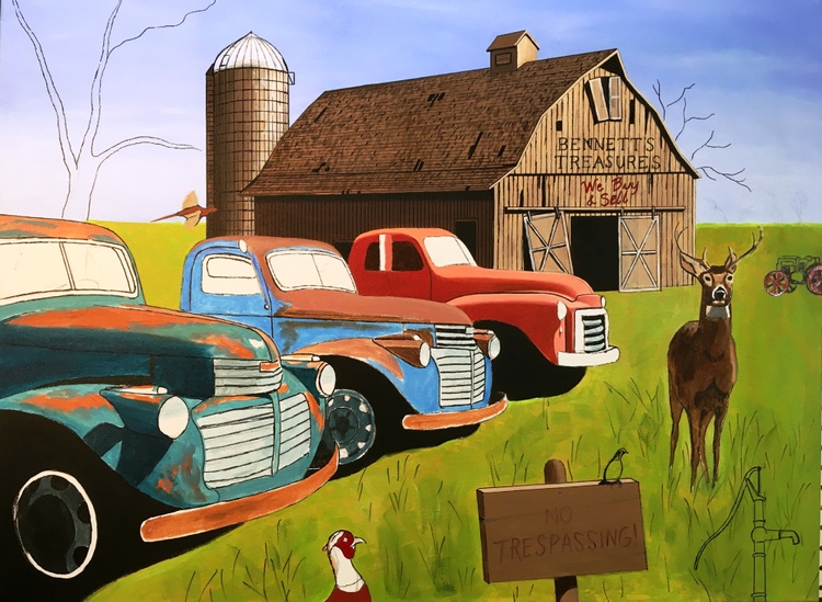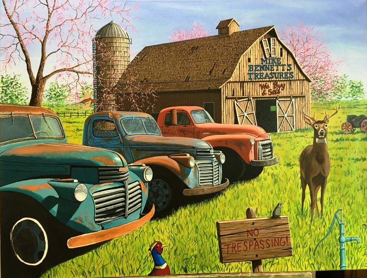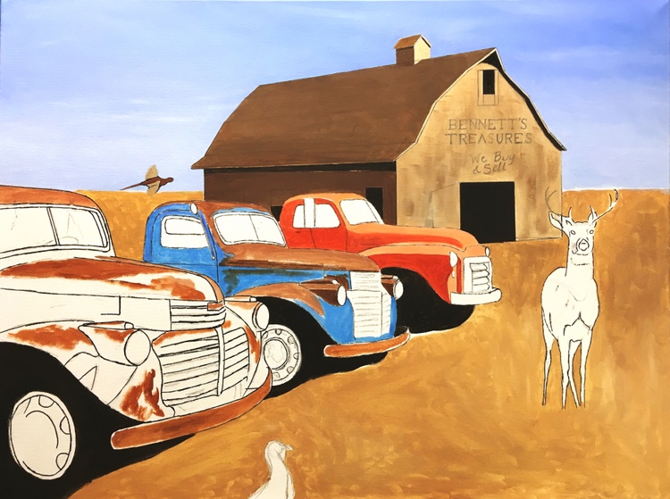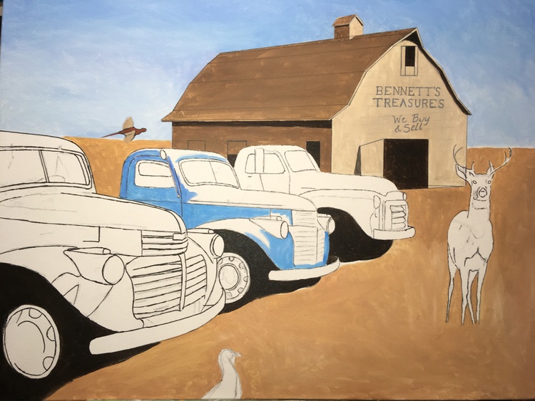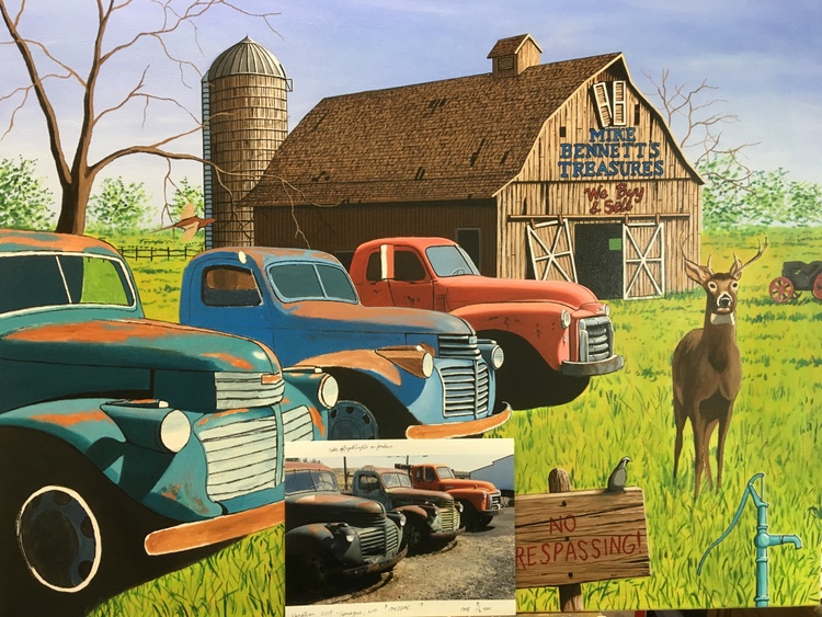 The painting features two 1941 GMC trucks, a 1948 GMC 1 1/2 ton truck and a 1958 W450 International Farmall tractor all for sale in this nostalgic farm scene. The trucks were photographed in a lot in the tiny town of Sprague, Washington.If you want to see a collection of photographs of these and other trucks, please check out the photographer, JONATHAN SACHS, book at :https://spraguetrucks.com/store