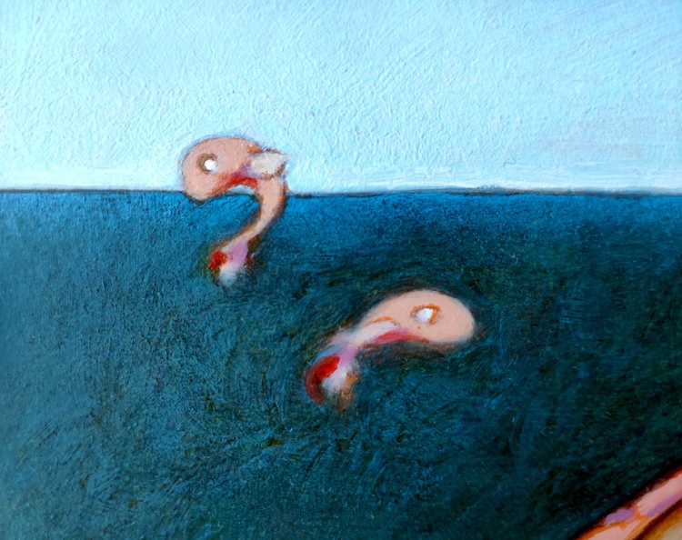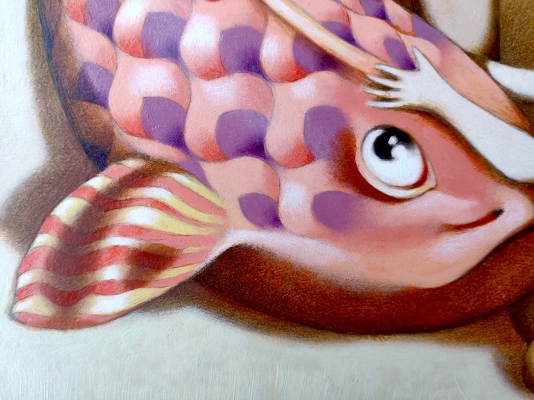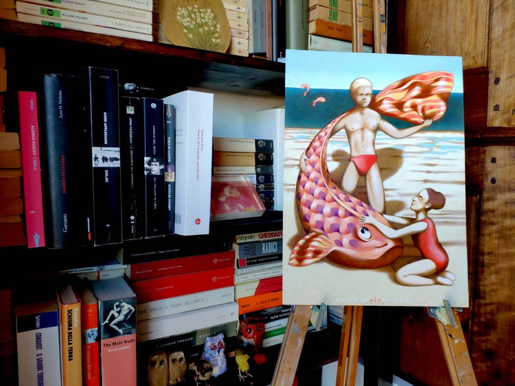 Oil on thick paper, 26 x 36 cm, 2020. ORIGINAL SOLD. In my childhood memories there are often the sea and the beach, the sun and the summer. The idea of finding a hidden treasure, a secret sparkling, with a hint of unease, the thrill of joy and panic that arose when, going fishing with my cousins, a fish took the bait on the hook, and that was finally the terrifying moment when we had to kill with our own hands that living creature.