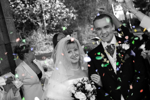 Confetti shot of bride and groom in teh grounds of Tamworth castle. Is the colouring of the confetti popular??