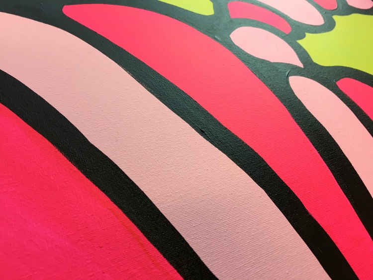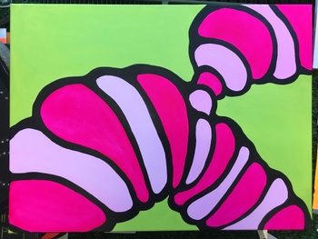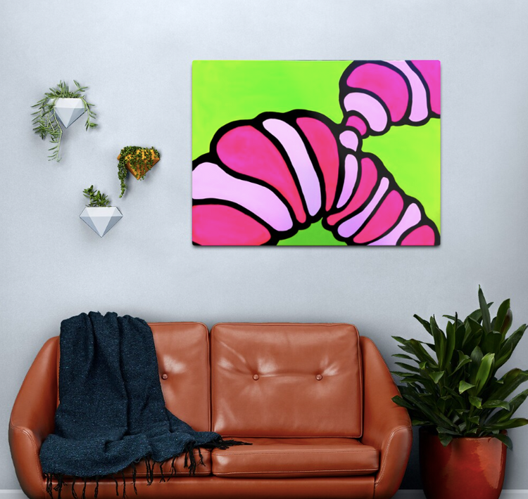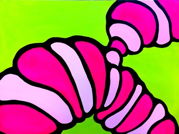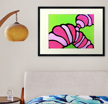 Explore "Croissant," an abstract masterpiece created with vibrant acrylics on stretched canvas. This artwork showcases playful creativity, incorporating elements of neon art, abstract shapes, and a vibrant palette of positive colors.