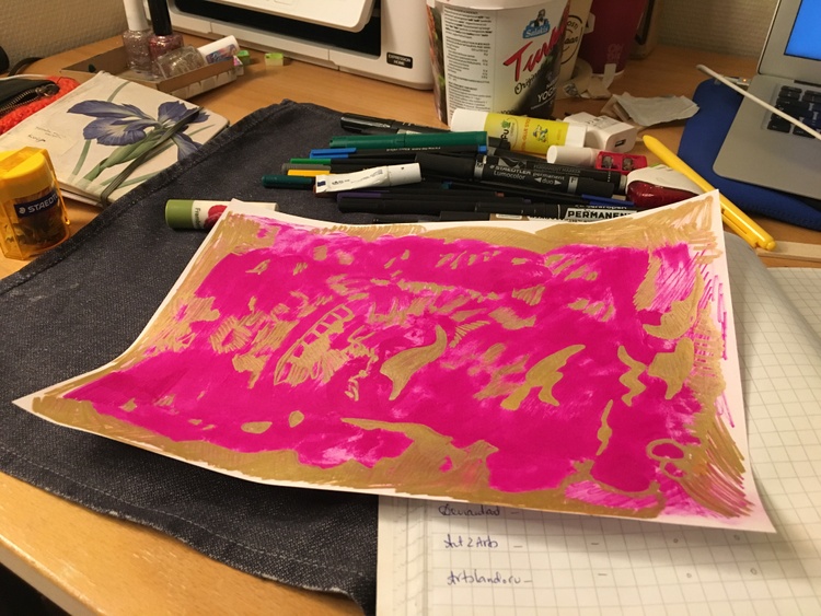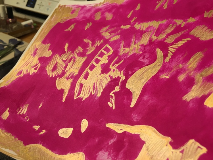 206. Bronze mysterious shapes in magenta abstract forest swimming in the sea. BIG FILE