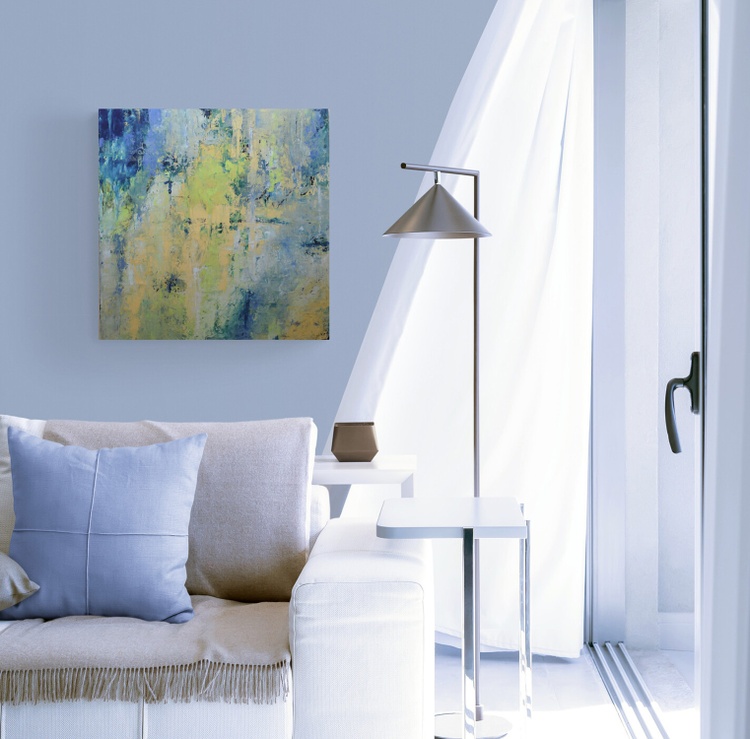 " L'Acqua Calma " a contemporary color field painting by joseph piccillo is a modern 30 x 30 acrylic palette knife painting on museum stretched canvas. My study of color continues with this blue painting inspired by the 22 years i spent my summers in Sicily and Key West. I find the cool blue colors both intense and calming.