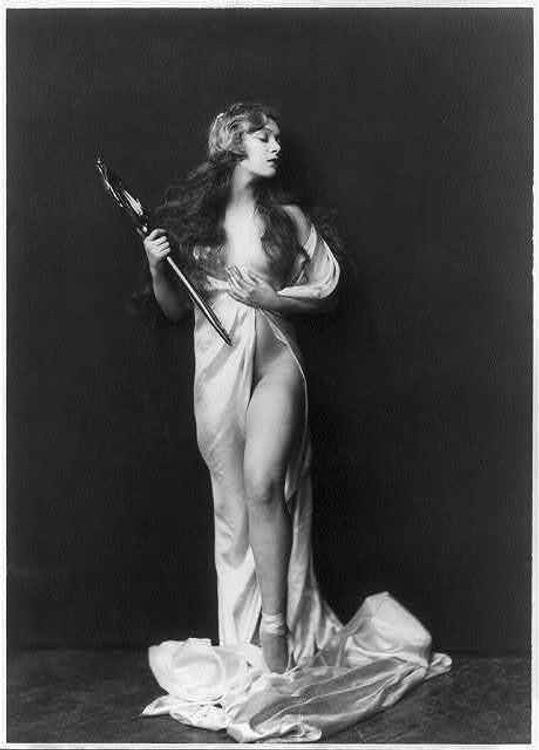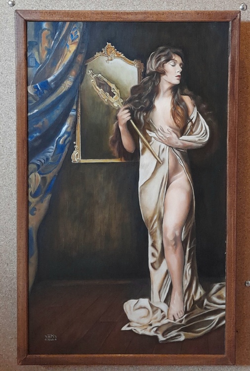 Caryl Bergman ((1912-2001) was born in New York City. At the age of fourteen she lied about her age so she could join the chorus of the Ziegfeld Follies. Flo Ziegfeld declared that "she had the most beautiful eyes in America". Painted from a black and white photo by Alfred Cheney Johnston, the added mirror and "Vermeer-style" curtain are from my imagination. Oil painting on a stained, wooden panel. 680mm. x 410mm.x 20mm. For sale.