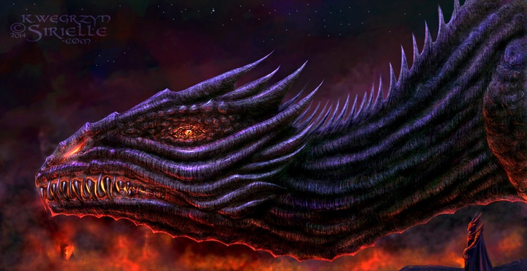 Balerion the Black Dread of "A Song of Ice and Fire" by G.R.R. Martin. The tiny knight at his side is Aegon the Conqueror.