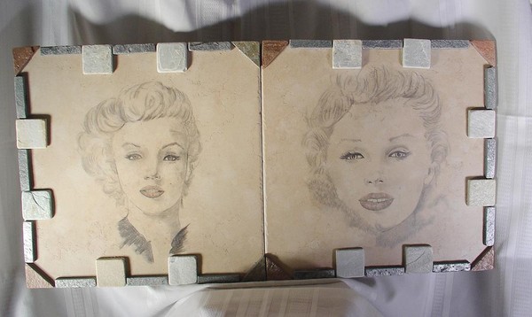 Marilyne monroes dual portriat. 16"x32" graphite on tile. Mosiac border tumbled marble and granite. 2005 exhibition piece