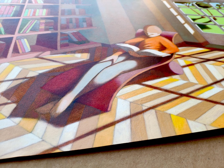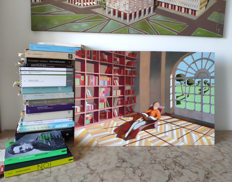 An original piece from the series “The reading room”, oil on thick paper, 60 x 40 cm, 20201. Original sold. In the reading rooms I wanted to represent a very simple idea, namely how much the content of a book can acquire reality for those who are reading it, becoming as present as the true reality. For this reason the rooms have a view towards the outside and the concrete world. Only by painting them, I realized that those windows are not an opening, the external landscape does not count at all, and the room is a refuge. The reader is somehow protected from the outside world as in a shelter, and his reality is only inside the book.