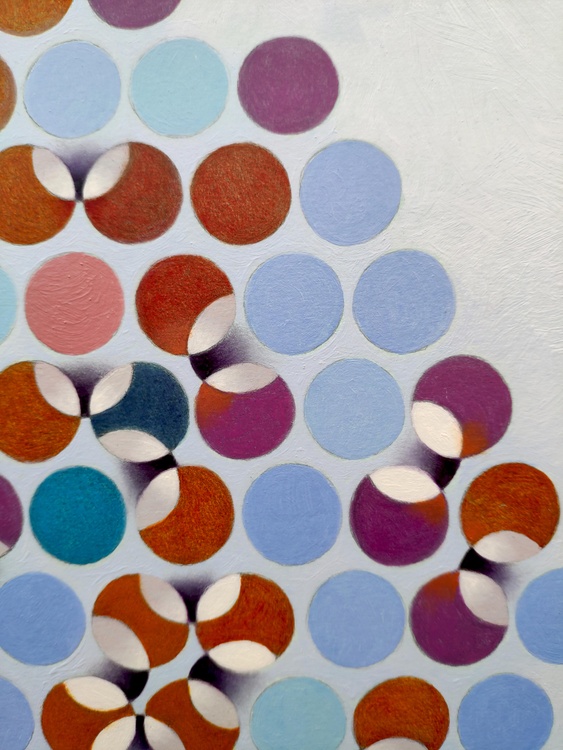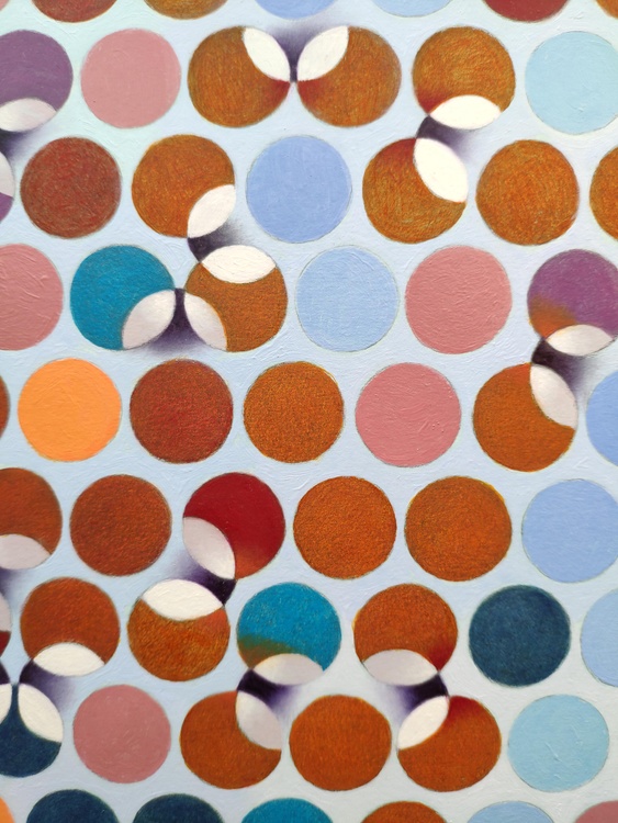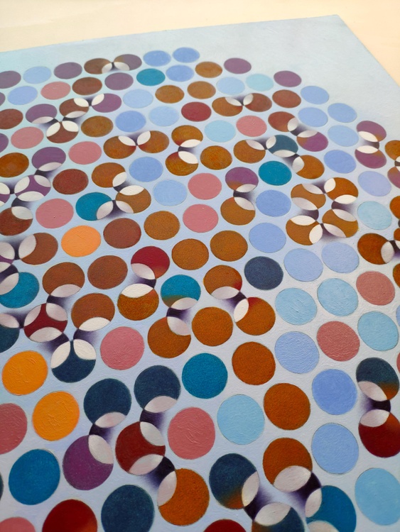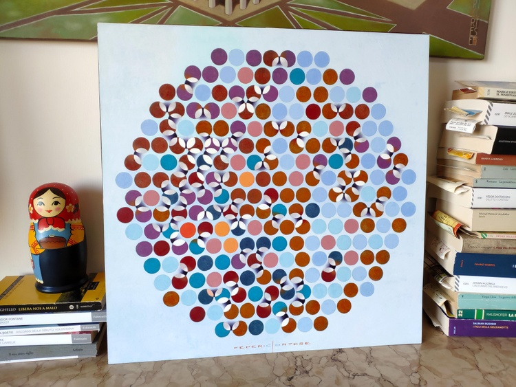 An original piece from the series “Chromatic”, oil on thick paper. 50 x 50 cm, 2021. Original sold. Artists are attached to a particular theme or compositional scheme often, till the point that it almost becomes an obsession, their personal and unmistakable signature. On a closer inspection, what counts in these schemes is the possibility, or possibilities, of generating variants. I believe that the artist is precisely attracted to the investigation of these variants, and the exploration of the limit to which one can go in their alteration. And if there are many variables involved in this game, the possibilities of creating variations become almost infinite. I believe that unconsciously, this creative process is also gratifying because it allows us to invent an illusory order, where the chaos of reality can create confusion. One could almost speak of a "collector's syndrome", except that in this case, the artist, not only, as in a collection of butterflies or stamps, always searches for new specimens and this research is never satisfied, but he even creates "specimens” by himself!