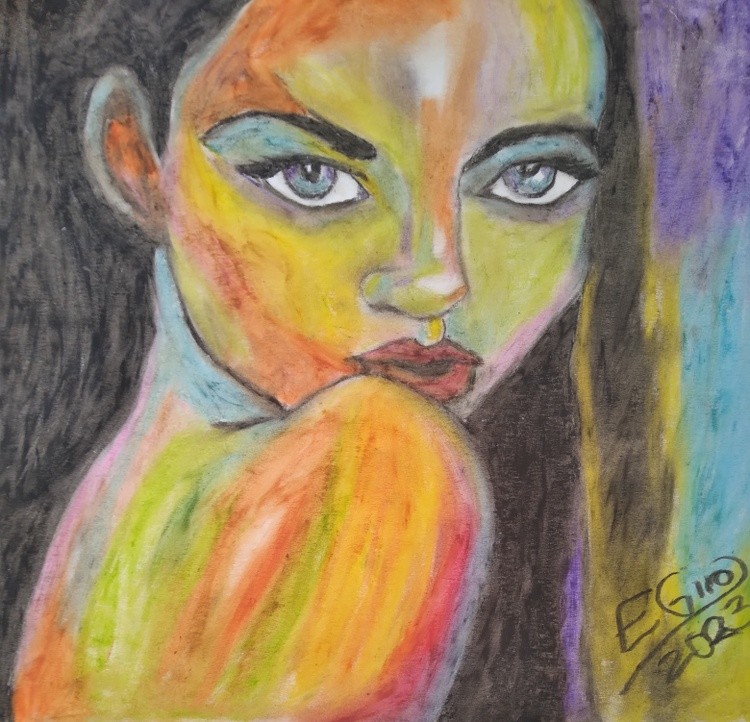 This is a lovely and beautiful blue eye girl with dark hair I painted using oil pastels on canvas.