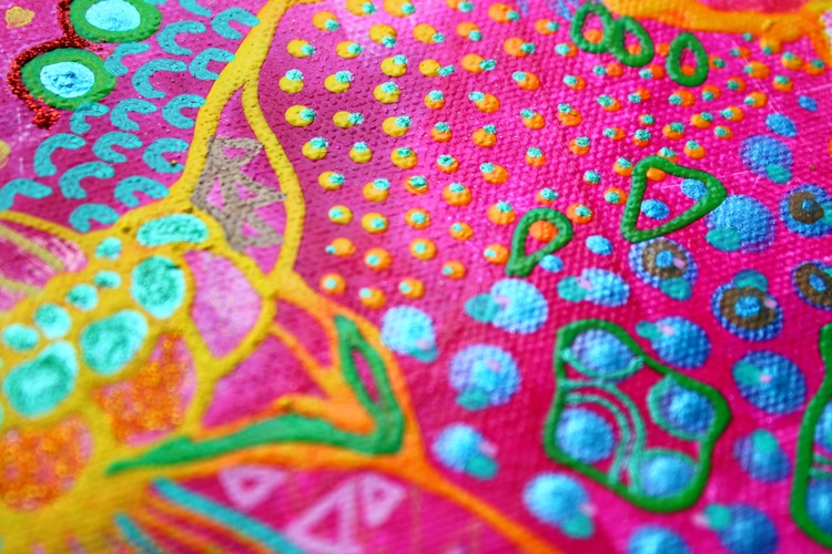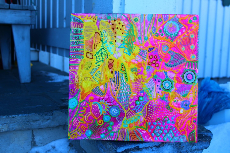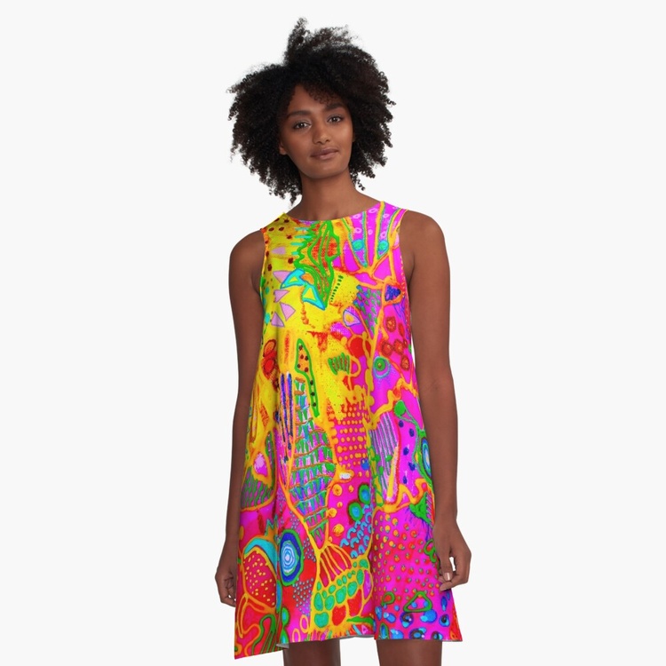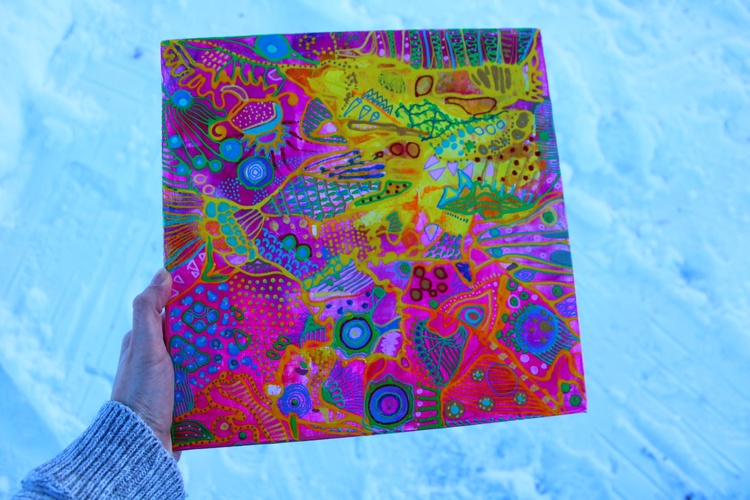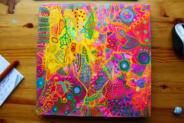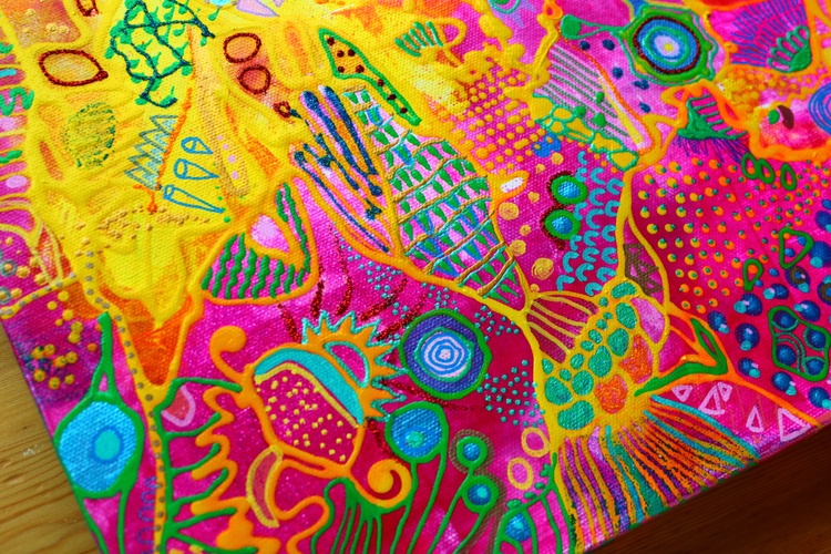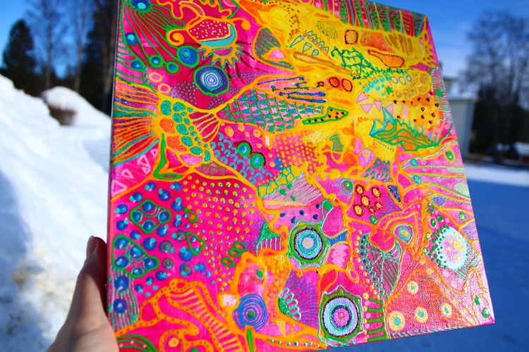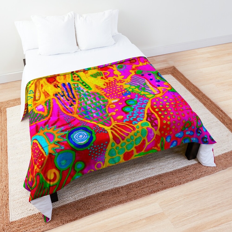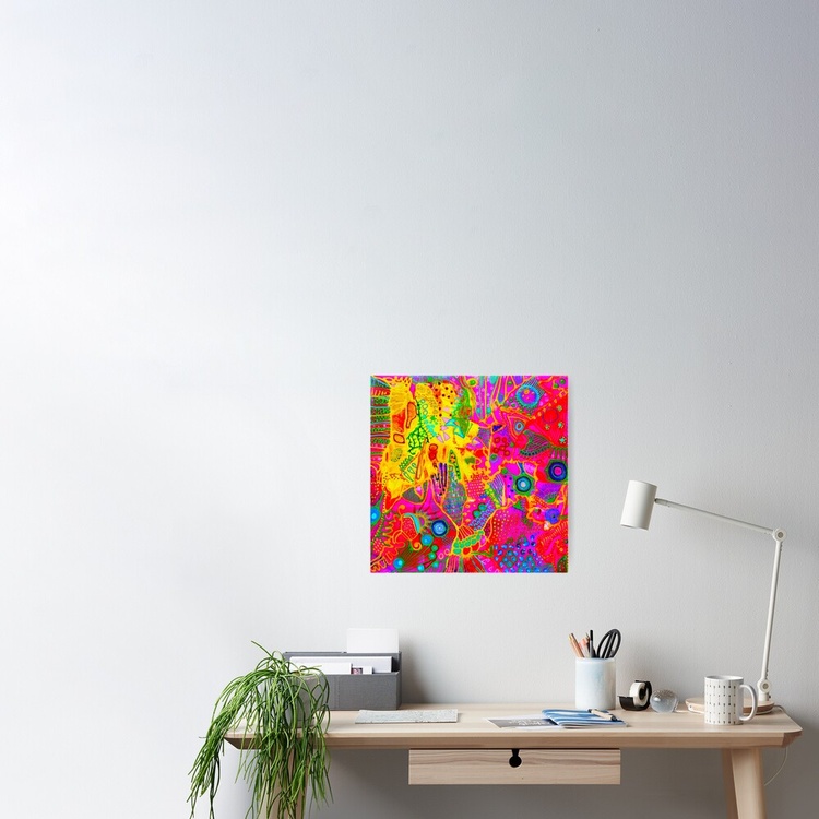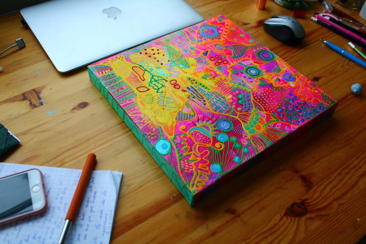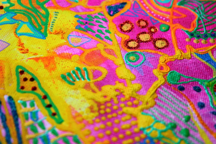 What is color psychology for healing? Color therapy and healing (also known as chromotherapy or light therapy) is a type of holistic healing that uses the visible spectrum of light and color to affect a person's mood and physical or mental health. What is the psychology of colors in art? Color psychology is defined as the “study of shades as a determinant of human behavior”. In short: artists take into consideration how the combination of colors in the artwork will make their public feel. They can even stimulate certain feelings and thoughts. How does color healing work? What is color therapy and how does it work? Color therapy, also known as chromotherapy uses the benefits of different colors and shades to affect your well-being. As each color has a unique light wavelength, the color therapy principles use the energy of each shade to boost your mental and physical health. What is the importance of color in art therapy? In art therapy, color is often associated with a person's emotions. Color may also influence a person's mental or physical state. For example, studies have shown that some people looking at the color red resulted in an increased heart rate, which then led to additional adrenaline being pumped into the bloodstream. Psychedelic subconscious intuitive doodle art by Veera Zukova, original abstract paintings directly from the artist. I decided to take plain paper and start working on it. Usually, I paint on stretched canvas, but I decided to enjoy the process completely this time. It was not only about the painting, the main idea was to enjoy the evening while watching my favorite series and doing some colorful doodling. I had no idea that works on paper would turn out so beautiful, I am shocked. It was a small challenge since I have had a significant depression due to my aggressive boss, so while sitting at home and watching my diet (I gained weight during the depression) I struggled with my art a lot and now finally I have found a way to let it out again. This is the result of psychological struggle, prayers, depressive mood, and will to survive. I am glad I did it. I do not like to reveal my process pictures since I have my own unique style and the painting process for me is a very private thing. I can describe how I did it. White paper, acrylic color spread with plastic card, dry, tape the paper with some ASMR thickening under and fully relax, catching the inspiration, adding tiny details, expressing myself through my subconscious colorful fantasy. I relax while painting. From the beginning till the end, my main point is to enjoy myself, I concentrate only on my mood. I never use any certain rules, everything is intuitive. I have a naturally good eye for colors. I can feel the material. The only thing I need to paint - is to be happy, and it is the hardest thing to achieve. I can not wait how these artworks will look like products on Redbubble :))) Thank you very much for reading my post, I really appreciate it. If you would like to see more of my art, you are welcome to visit my page. https://linktr.ee/veerazukova I like to add my artwork to my Redbubble shop :) My art is very colorful and looks great on products. Welcome to my shop. The original painting is done on paper with acrylics, gouache, marker, pen, and tempera. My artwork can only be used as a home decoration. In my Redbubble shop, you will find over 260 different products with my art as a design. Redbubble products are a great alternative to traditional painting and are much more affordable. Please visit my link if you would like to see more. I am very proud of this artwork. I managed to express myself completely through all the shapes and colors. I love how the design looks on products. In my personal opinion this artwork is just great, love the result. Art brings me a lot of satisfaction. The original painting is made on paper with acrylic, gouache, markers, tempera, pen, and markers. It took me one evening to paint it. I love it! The process of painting was very calming. The color composition is very balanced. The artwork looks fresh, joyful, and very inspiring. I hope you like it too :))) --- This is a designed product with my art. I like to add pictures of my paintings to my Redbubble store. My abstract art is a great pattern for clothes and interior units. My artwork looks great on a bigger scale, it brightens up the room and creates a massive positive mood through the colors. What is color psychology for healing? Color therapy and healing (also known as chromotherapy or light therapy) is a type of holistic healing that uses the visible spectrum of light and color to affect a person's mood and physical or mental health. What is the psychology of colors in art? Color psychology is defined as the “study of shades as a determinant of human behavior”. In short: artists take into consideration how the combination of colors in the artwork will make their public feel. They can even stimulate certain feelings and thoughts. How does color healing work? What is color therapy and how does it work? Color therapy, also known as chromotherapy uses the benefits of different colors and shades to affect your well-being. As each color has a unique light wavelength, the color therapy principles use the energy of each shade to boost your mental and physical health. What is the importance of color in art therapy? In art therapy, color is often associated with a person's emotions. Color may also influence a person's mental or physical state. For example, studies have shown that some people looking at the color red resulted in an increased heart rate, which then led to additional adrenaline being pumped into the bloodstream.