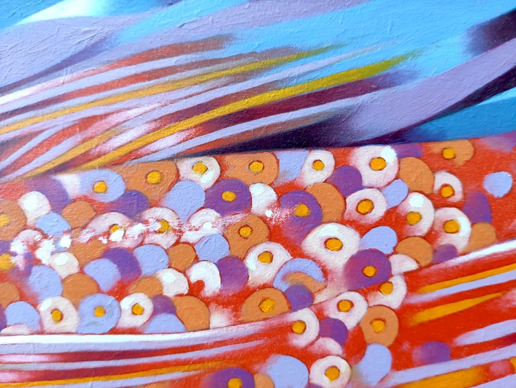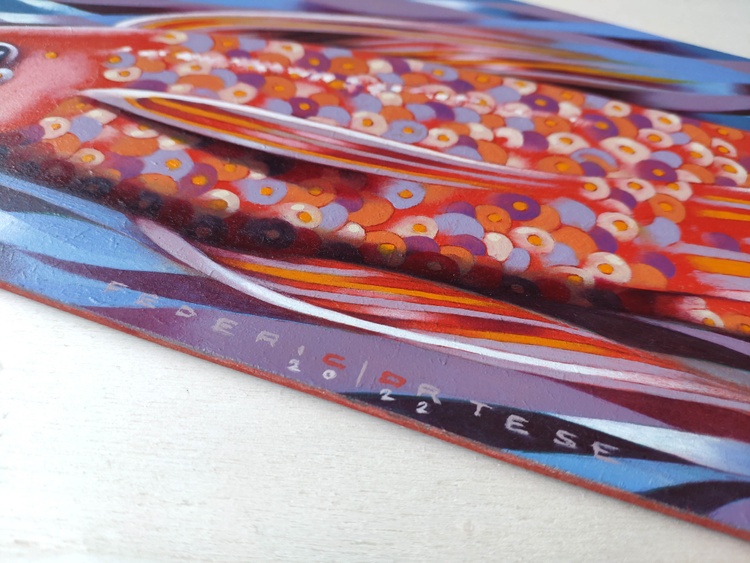 An original piece from the series “Small fish”, oil on wood panel , 38 x 15 cm, 2022. I open my eyes underwater. The contours of objects are blurred. The contrast between the colors is softened by a veil that makes everything more uniform. The refraction of the light is influenced by the ripples in the surface of the sea. Flashes of light dance on things, concentrating and dispersing, giving the surface of the objects it stands on the impression of velvet. The fish move slowly among the seaweed, all things appear together, faded and dissolved into one another. In case of sale shipping is worldwide free.