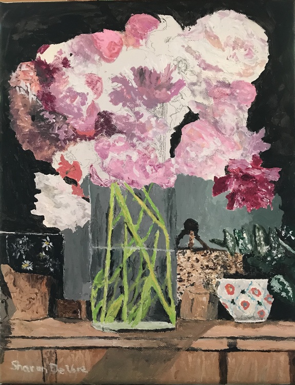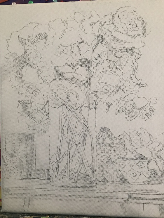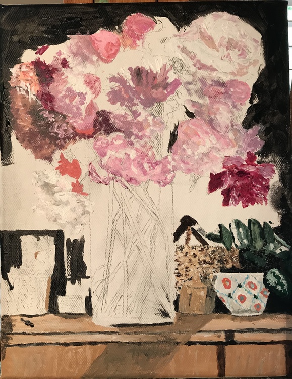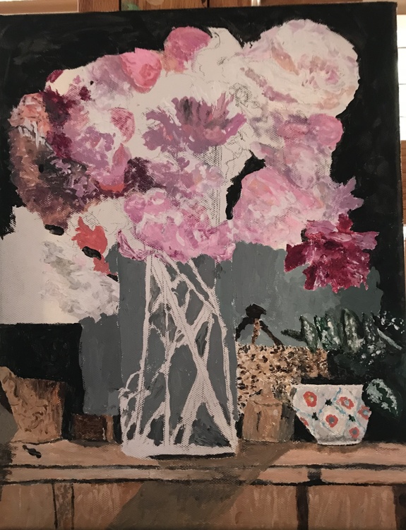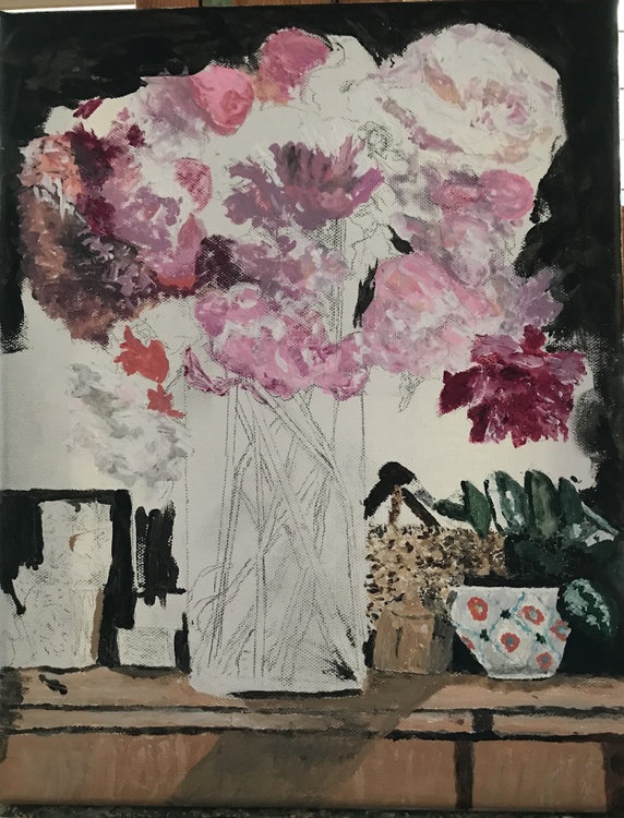 This is my first real painting since my strokes. Yes I have been painting my patch works because Florida does not inspire me at all. I call this painting "Tracy's Still Life" since my daughter sent me the photo of her beautiful bouquet from her's & her husband Paul's garden. I thought it in such a perfect setting and wanted to paint it Very badly & Tracy encouraged me.