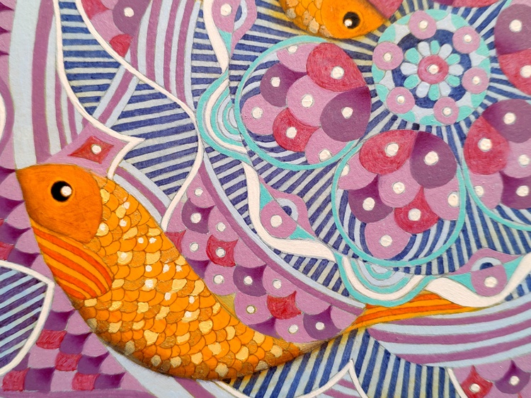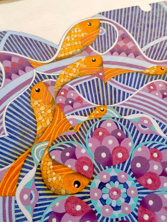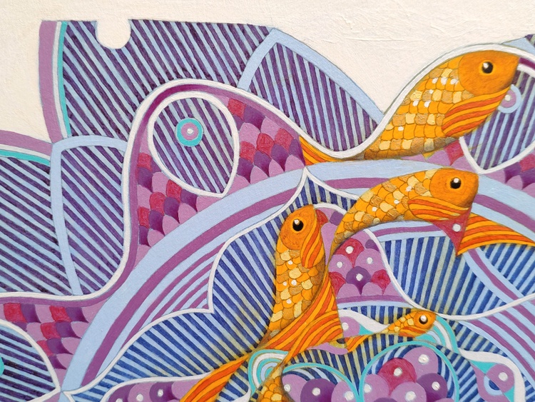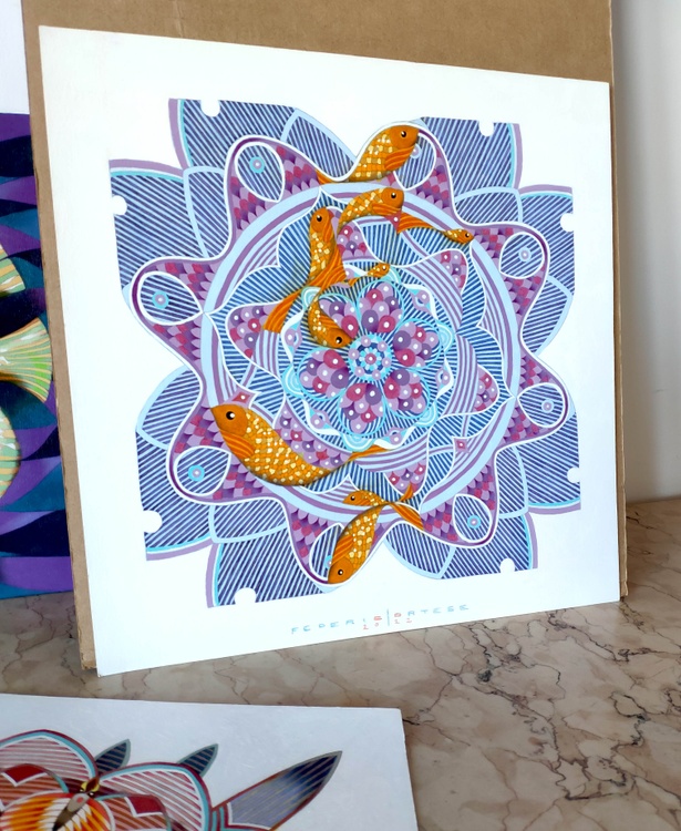 An original piece from the series “Snowflakes”, oil on thick paper, 35 x 35 cm, 2022. Someone teaches us that the snowflakes are different from each other since we are small children. We learn that they are formed with a crystallization process that follows a geometric pattern that changes each time, indefinitely, never having the possibility of a repetition. The ice crystal takes shape slowly, expanding from a central point to the surrounding space, obeying to some strict symmetrical scheme, until all unallocated space is filled with these icy branches. What happens if in this process, the atoms of the water, in the meanwhile they are solidifying, encounter an obstacle, a slag, an impurity? Will it also remain trapped inside the grid? Will it be absorbed by this geometric cage, or would it be able to break the symmetry, imposing its diversity? In case of sale shipping is worldwide free.