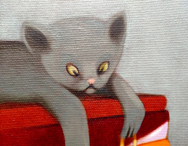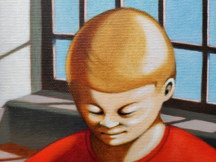 Oil on canvas. 50 x 60 cm, 2021. In the reading rooms I wanted to represent a very simple idea, namely how much the content of a book can acquire reality for those who are reading it, becoming as present as the true reality. For this reason the rooms have a view towards the outside and the concrete world. Only by painting them, I realized that those windows are not an opening, the external landscape does not count at all, and the room is a refuge. The reader is somehow protected from the outside world as in a shelter, and his reality is only inside the book. In case of sale shipping is worldwide free.