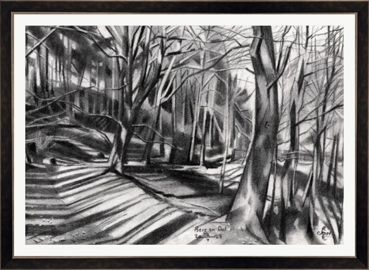 Returning to Cubist Styling This graphite pencil drawing ‘Berg en Dal – 02-05-23’ is a welcome change from 9 consecutive impressionist landscapes I made. Somehow I felt attracted to do a cubist one, remembering some oldies from the past. Actually I always thought Filosofendal (Valley of the Philosophers) – 20-10-15 was a good one. However, I didn’t get much response to it at that time but I matched my ambitions back then. Naturally, I was in the midst of my cubist discoveries and a lot happened since then. My roundism revolution evolved throughout the years and I made a lot of surrealist art works. Anyway, you never know how the wind will blow. So I let myself carry away on whatever wind as whim may blow. Tomorrow winds can change. A Well-Known Place Strangely this drawing resembles my last one a bit with regard to the lighting. I was quite happy with the tonal rhythym in that one. Consequently I felt inclined to do another one but more styled. Being a bit bored of landscapes around me I dug into my pile of reference pictures and found this smashing one of Berg en Dal. It’s a place not far away from where I was born and raised. In fact I know it rather well, situated in the hills to the east of Nijmegen. Of couse I made a whole series in the past. Once in a while I return there to dwell in its forest and hills. Quite ridicilous for foreigners, I guess. Elevation differences are really not that extreme, a mere 120 meters but that’s a lot in The Netherlands. The Actual Spot The actual spot where this picture was taken is very near to the one I based an earler pastel on. That was ‘Berg en Dal 01 (2014)’. I think I might have taken it on the samel path called ‘Wyler’. The view as depicted here is directed in the length of the path. Winding downhill it leads to the village of Beek and offers some nice vistas in between. The challenge was to keep track of the path lingering downwards through all the trunks,leafs and branches. Therefor I only indicated them in the back rudimentarily. No details. I kept those for the front. Some suggestions of pebbles and leaves. Epilogue Last but not least, I dedicate this drawing to my niece Carla Akkers who remains in the last days of her life on earth. I got the call from her sister Mieke finishing this drawing. Much too young to leave I take comfort in the thought she must have known this beautiful place as well. It’s near to where she was also born. May the play of light and dark through leaves in nature accompany you to the other side. Graphite pencil drawing (Sakura 0.5 mm, 4B) on Winsor & Newton Bristol board paper (21 x 14.8 x 0.1 cm – A5 format) Artist: Corné Akkers