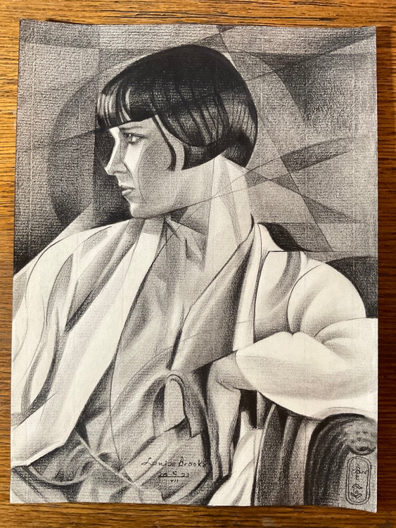 Stardom This graphite pencil drawing ‘Lulu - 07-07-23’ is another homage to the famous flapper girl, celebrity and moviestar. To whom it may concerns: to me she remains an unexhaustable source of inspiration. She has been photographed many times in the 1920s and 1930s during the so-called ‘art deco’ era. Combine that bobcut with dramatic lighting and you’ll catch my drift. Surely her life hasn’t been easy post-Hollywood but ups and downs make her all the more intriguing. A true star in her own right. That’s just a quick carreer sketch and now for the artistic one. Artistic Interpretations With her bob haircut she continues to fit my cubist needs quite nicely. Of course it’s not the first time I drew or painted her. The last one was from December 2022. In fact, the reference picture I used for the current one is from that same session. A slightly differerent angle though. Sometimes for outsiders it can look pretty daft to use an artistic motif for the second time. For artists it’s different. Dutch portraitist Philip Akkerman uses only one: his own portrait for 40 years now. I have done the same with a single motif, creating smaller and bigger series in the past. So it’s all about the ‘how’ and not the ‘what’. Every drawing and painting spawns a different interpretation. Endless possibilities for creation. Skip the Flowers This time I set out to discover what I could get more out of a fantastic photo. Put on the track of combining straight and curved lines I decided to do the top of her body. Her hand on the chairrest looked beautifully styled. Almost completely hanging down vertically. However, flowery patterns on her vest and blouse I skipped this time. The same goes for the geometric butterfly-like patterns in the back. Instead, the pattern created by extrapolating features of her head into the negative space around it did the job. The same goes for the attire. Finally I’m happy with the balance between straight and curved lines and planes. A promise for the future. Graphite pencil (Faber Castell Pitt Graphite Matt pencil 14B) drawing on Fabriano Ingres paper (21 x 28.2 x 0.1 cm) Artist: Corné Akkers