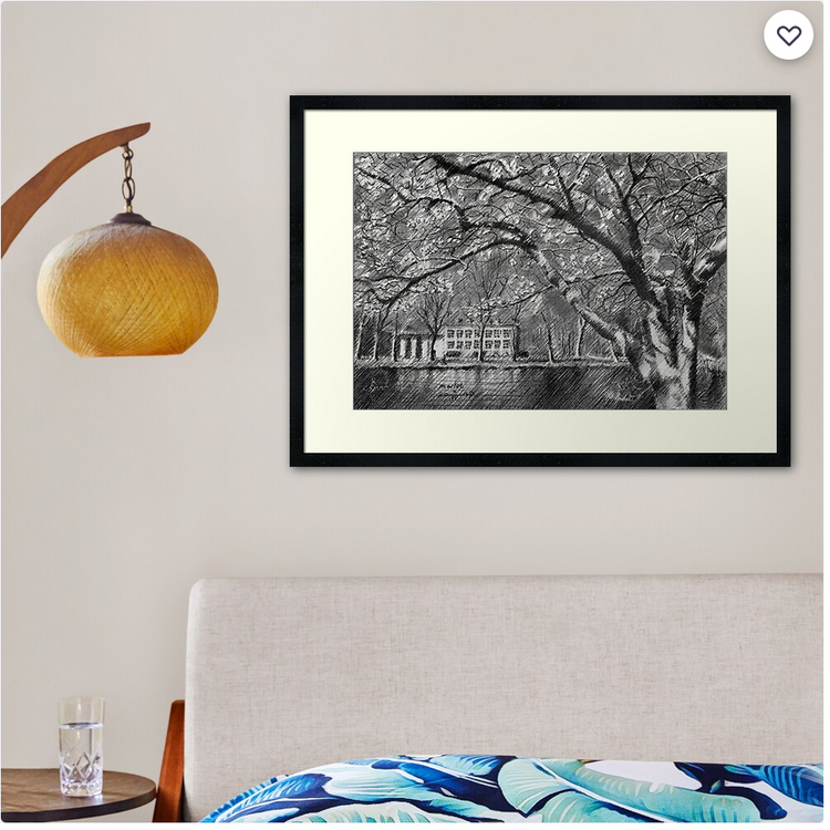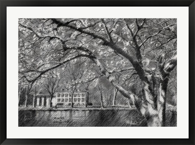 Merely a Park This graphite pencil drawing ‘Marlot – 11-04-23’ follows my previous one depicting the Noteboompark in Voorburg. We stay in the region because Marlot is not far away from where I live as well. Just around the corner so to speak. Consequently I am a lot to be found there. Especially during Corona times when I walked through Park Marlot, both the residential area and the forest. Well, in The Netherlands well it comes to nature everything is relative. Hardly a forest, merely a raked park really with a couple of canals and meadows running across it. I even sketched such a little canal a couple of years back. It is one of those parks characteristic of The Hague. Trees, a big meadow and an old country house can be found in each and every one of them. A Perfect Combination And so does Marlot have one: an old house dating back from the 17th century. For no particular reason I haven’t drawn that one before. Time to add it to my list of completed park projects. A couple of more to go. Another reason was the other day I was walking towards ‘Huis Marlot’. Suddenly I was confronted with a great view on the house underneath a tree in blossom. There is a little pond between the building and the tree which made the scenery perfect for a drawing. To me that’s the perfect combination: a man-made structure, water (reflections) and vegetation. Overcoming Difficulties Like always every little art work in the making presents its difficulties to overcome. I found it relatively tough to contrast the dark blue sky with the blossoms. Whereas the thick branches were dark enough the blossoms and little leaves were too weakly light. The hatched strokes simply seemed to absorb them, creating a fidgety look. So I had to fade out the hatchings a bit in order to get the desired contrast: smooth and busy pencil lines. All-in all a nice impressionist study to execute. Graphite pencil drawing (Sakura 0.5 mm, 4B) on Winsor & Newton Bristol board paper (21 x 14.8 x 0.1 cm – A5 format) Artist: Corné Akkers