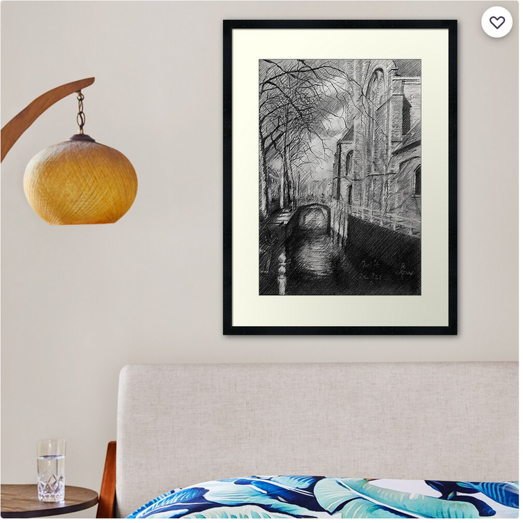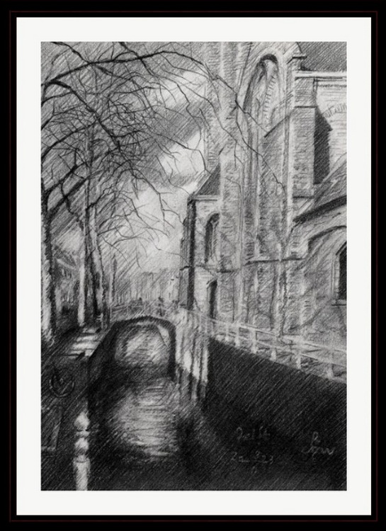 Preparatory Trip This graphite pencil drawing ‘Delft – 19-03-23’ is based on a trip to that city only yesterday. You see, I was visiting the place with my parents in preparation of our visit to Amsterdam. Sunday the 19th that was, visiting the Rijksmuseum for the big Vermeer exhibition. The Prinsenhof offered a great exhibition on the times of Vermeer in Delft. After the visit to the museum we were passing by the Old Chuch, also called the ‘Old John’. The weather wasn’t particularly nice, yet not so cold anymore. Occasionally there was a reasonable amount of sun though. Suddenly I saw a motif that attracted me. A dark side in the canal, some shadows around the bridge and some branches contrasting the man-made church structures. Honoring Vermeer Since I fancy doing landscapes latety why wouldn’t this scenery be a perfect follow-up to the last one? For no particular reason I didn’t do much drawings on Delft yet. However, I love the place and it’s close to where I live. My only one was a surrealist drawing from 2017. Time to straighten this out and do a second one. Besides that, it’s Vermeer’s Year. About time to honor him. Soon weather conditions will improve and trees will be in leaf again. Delft will be so much more fun then. Four Key Elements When I come to think of it, I’m always attrackted to four key elements in a drawing. These are: the play of light and darkness, a landmark like a building, vegetation and water reflections. Trees only, especially in leaf and tightly packed, can pretty much amorphous. Buildings only can look a tad liveless. Therefor I like the very interaction between them. They give me repetition in variation and variation in repetition. Reflections in the water is a sort of bonus. Surely, things reflected in water can look mysterious. In a way water serves as a gateway to other dimensions. Can you detect them within yourself? Graphite pencil drawing (Sakura 0.5 mm, 4B) on Winsor & Newton Bristol board paper (21 x 14.8 x 0.1 cm – A5 format) Artist: Corné Akkers