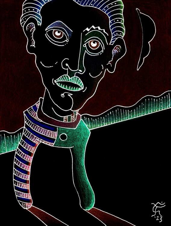 Of course, sometimes you shake a guy with this look and will hear something small rattling around inside. So, again, looks can be deceiving. This is a 6 by 4.5 inches gel pen drawing on medium bond acid-free paper. Yeah, Original Jones Art adopts that look of thoughtful contemplation somewhat often but there could be some small gear or part a bit on the loose side here in northwest Austin, Texas.