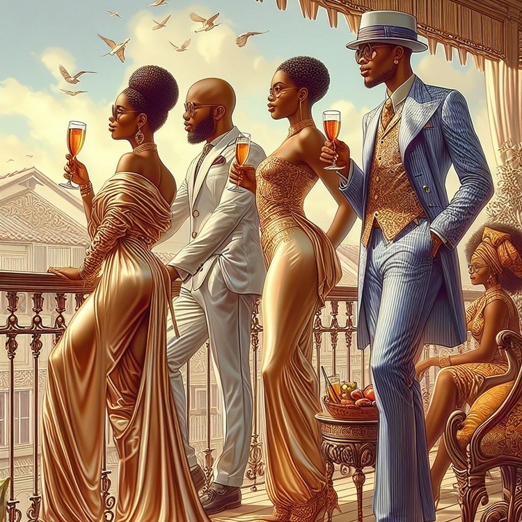 more images on nadavrock.com/ Explore My Store: Order Real-World Designs nadavrockprints.com/ Amidst the grandeur of the city's embrace, Where time holds its breath in an elegant space, A gathering shines with the sun's own grace, A vision of splendor, none could replace. With goblets raised in the soft morning light, Their silhouettes gleaming, oh so bright, They stand in finery, pure and resplendent, Capturing moments, serene and transcendent. The gowns flow like molten gold, Stories of majesty silently told, The gentlemen dapper, in suits so fine, Sipping the day's first sparkling wine. The air is alive with a jubilant cheer, A celebration of now, of here, of the near. The flutter of birds, a serene sight, Harmonizing with the city's light. Their toast, a symbol of luxury's bloom, In the warmth of a sunlit, opulent room. Here's to the moments that shine and entice, In this portrait of paradise.