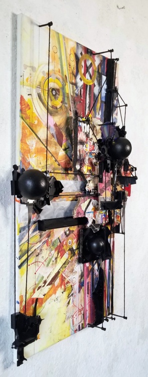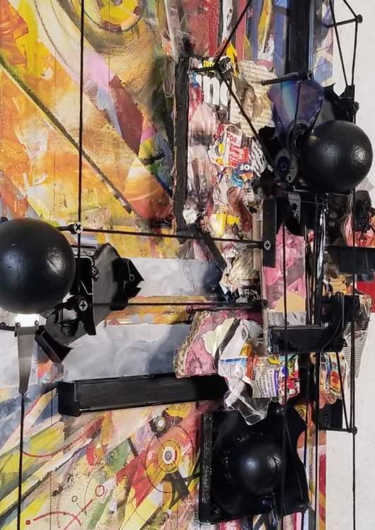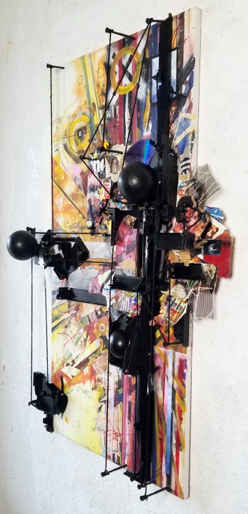 mixed media: acrylic paint, pen, string, styrofoam, paper collage, broken cd, mesh, nails, broken cassette on stretched canvas. 30" x 20" x 4" KNewArt '24 $2500.00