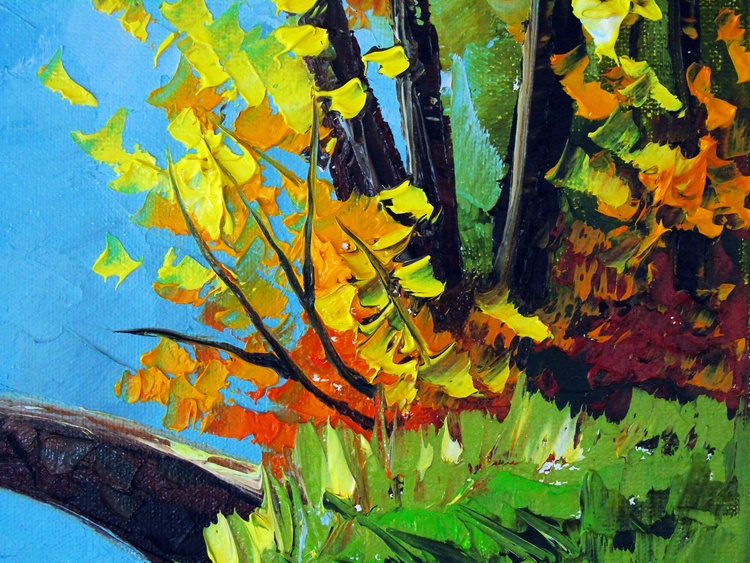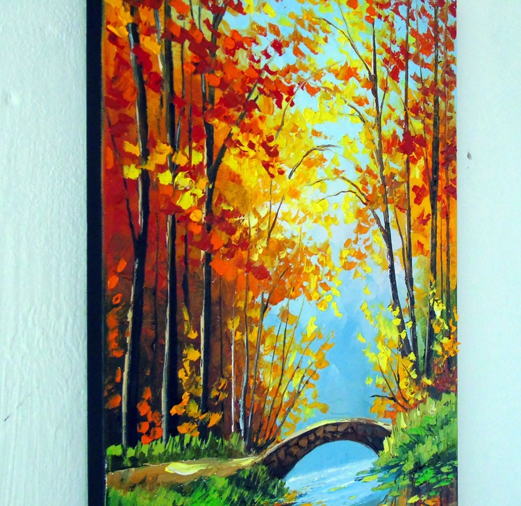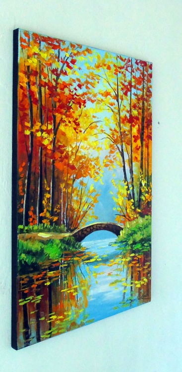 Autumn Pond with Bridge, painting is done with high quality oil on canvas with painted edges, 100% handmade for family or as a gift for positive vibes . Ready to hang. In this piece, my passion for the vibrant dance of autumn is alive in each stroke. I aimed to capture the ephemeral beauty of the changing leaves, their fiery oranges and reds reflected in tranquil waters—a celebration of nature's fleeting symphony. The bridge symbolizes a journey, inviting viewers to cross into a world alive with color and light. This painting exudes an energy that brightens and inspires, an everlasting autumn to uplift any space.