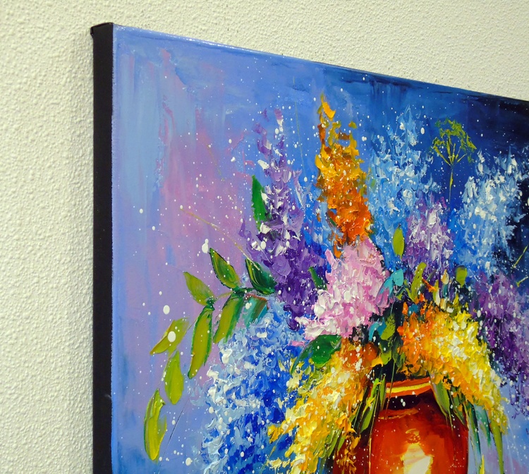 A bouquet of viburnum is an oil painting on canvas with painted edges, 100% handmade with a palette knife and high-quality paints, for a gift or for the family. Only positive emotions will be given by my work. Ready to hang. In this oil painting, I sought to capture the essence of nature's vibrancy and the richness of life. My brushstrokes are a dance of color and light, creating a symphony in reds and greens, with a backdrop that holds a whisper of mystery. This piece is a testament to the beauty that flourishes in the quiet corners of the world; it is meant to bring a burst of life and a touch of the poetic to any space it adorns.