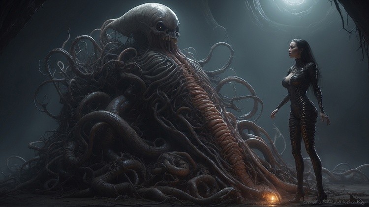 A voluptuous woman, her curves accentuated by a snug jumpsuit and elevated by stiletto heels, appears visibly unsettled faces a massive, horrible, tentacled alien. Designed with AI & Photoshop. Copyright © 2024 - Krahl D'Opilarys If you like my work and have a project, you can contact me and learn about the different services I offer on https://fr.fiverr.com/krahly