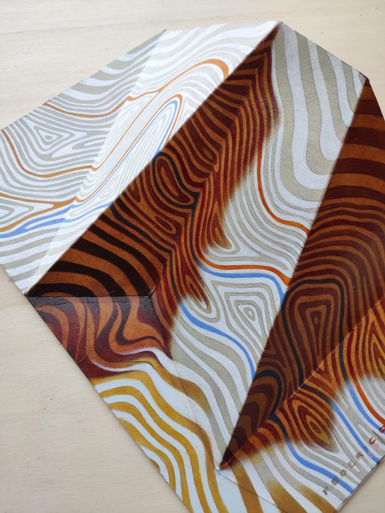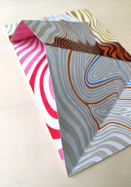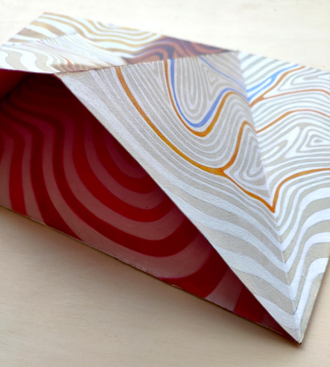 An original piece from the series “Reliefs”, oil on paper and wood panel, 19 x 30 cm, 2022. Original sold. When we consider a road map or a map of the territory we note that they contain different information that are represented by different means, according to the purpose for which they were created: each time we find colors, symbols and words that recall a precise meaning. What happens if I take these techniques of representation, these symbols, and take off the scope for which they were created and mingle them with each other? Will it be for the reader a text in a foreign language, that is meaningless, or through the world of associations and references that each of us possesses, will generate a new language and associate to those images a new meaning? In these paintings, in particular, I am interested in contours that highlight the points of the territory which are at the same elevation. In my works, they become the borders of different colors or shades, bringing out hidden shapes and concentric curves.